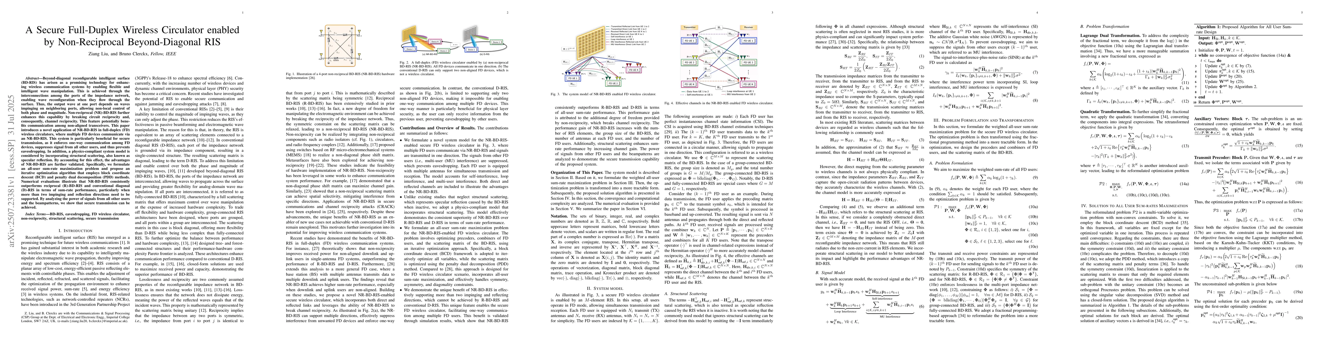 Beyond-diagonal reconfigurable intelligent surface (BD-RIS) has arisen as a promising technology for enhancing wireless communication systems by enabling flexible and intelligent wave manipulation. This is achieved through the interconnections among the ports of the impedance network, enabling wave reconfiguration when they flow through the surface. Thus, the output wave at one port depends on waves impinging on neighboring ports, allowing non-local control of both phase and magnitude. Non-reciprocal (NR)-BD-RIS further enhances this capability by breaking circuit reciprocity and, consequently, channel reciprocity. This feature potentially benefits communication among non-aligned transceivers. This paper introduces a novel application of NR-BD-RIS in full-duplex (FD) wireless circulators, where multiple FD devices communicate via an NR-BD-RIS. This system is particularly beneficial for secure transmission, as it enforces one-way communication among FD devices, suppresses signal from all other users, and thus prevents eavesdropping. In addition, a physics-compliant system model is considered by incorporating structural scattering, also known as specular reflection. By accounting for this effect, the advantages of NR-BD-RIS are further validated. Specifically, we formulate an all-user sum-rate maximization problem and propose an iterative optimization algorithm that employs block coordinate descent (BCD) and penalty dual decomposition (PDD) methods. Numerical evaluations illustrate that NR-BD-RIS consistently outperforms reciprocal (R)-BD-RIS and conventional diagonal (D)-RIS in terms of sum-rate performance, particularly when more than two impinging and reflection directions need to be supported. By analyzing the power of signals from all other users and the beampatterns, we show that secure transmission can be achieved.