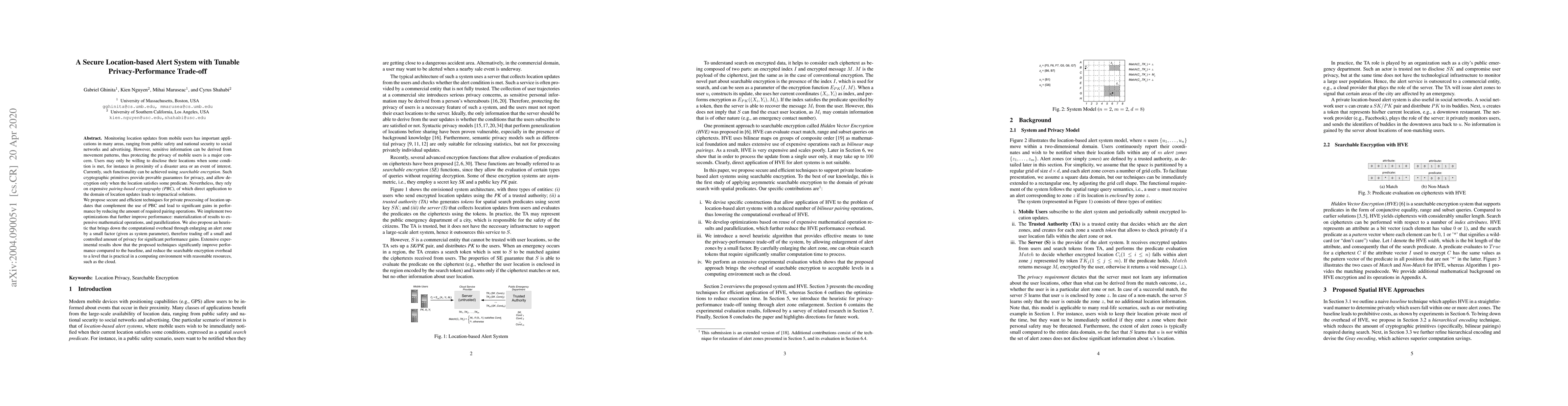 Monitoring location updates from mobile users has important applications in many areas, ranging from public safety and national security to social networks and advertising. However, sensitive information can be derived from movement patterns, thus protecting the privacy of mobile users is a major concern. Users may only be willing to disclose their locations when some condition is met, for instance in proximity of a disaster area or an event of interest. Currently, such functionality can be achieved using searchable encryption. Such cryptographic primitives provide provable guarantees for privacy, and allow decryption only when the location satisfies some predicate. Nevertheless, they rely on expensive pairing-based cryptography (PBC), of which direct application to the domain of location updates leads to impractical solutions. We propose secure and efficient techniques for private processing of location updates that complement the use of PBC and lead to significant gains in performance by reducing the amount of required pairing operations. We implement two optimizations that further improve performance: materialization of results to expensive mathematical operations, and parallelization. We also propose an heuristic that brings down the computational overhead through enlarging an alert zone by a small factor (given as system parameter), therefore trading off a small and controlled amount of privacy for significant performance gains. Extensive experimental results show that the proposed techniques significantly improve performance compared to the baseline, and reduce the searchable encryption overhead to a level that is practical in a computing environment with reasonable resources, such as the cloud.