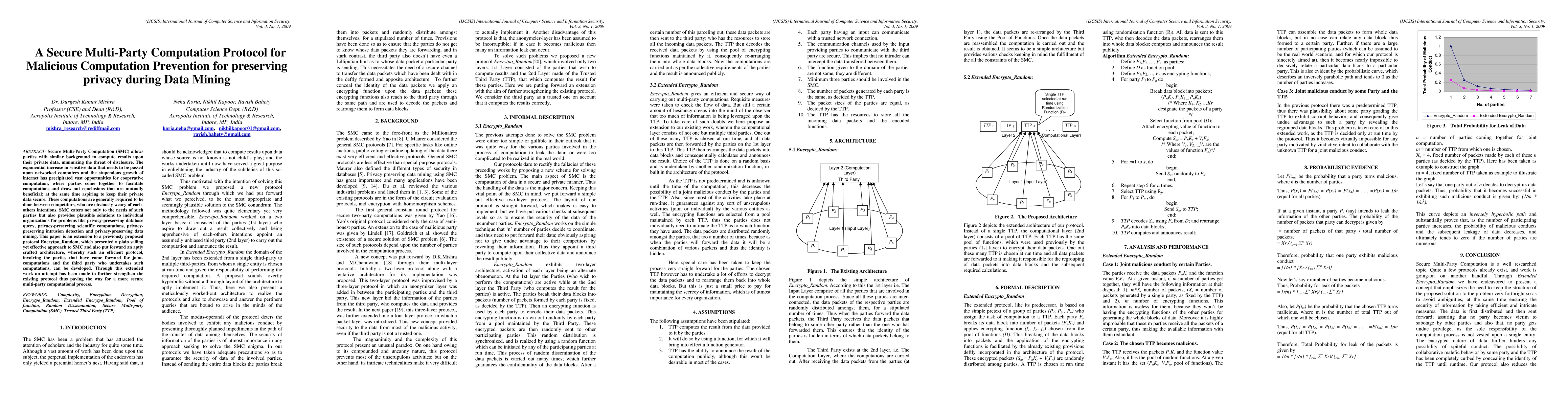 Secure Multi-Party Computation (SMC) allows parties with similar background to compute results upon their private data, minimizing the threat of disclosure. The exponential increase in sensitive data that needs to be passed upon networked computers and the stupendous growth of internet has precipitated vast opportunities for cooperative computation, where parties come together to facilitate computations and draw out conclusions that are mutually beneficial; at the same time aspiring to keep their private data secure. These computations are generally required to be done between competitors, who are obviously weary of each-others intentions. SMC caters not only to the needs of such parties but also provides plausible solutions to individual organizations for problems like privacy-preserving database query, privacy-preserving scientific computations, privacy-preserving intrusion detection and privacy-preserving data mining. This paper is an extension to a previously proposed protocol Encrytpo_Random, which presented a plain sailing yet effective approach to SMC and also put forward an aptly crafted architecture, whereby such an efficient protocol, involving the parties that have come forward for joint-computations and the third party who undertakes such computations, can be developed. Through this extended work an attempt has been made to further strengthen the existing protocol thus paving the way for a more secure multi-party computational process.