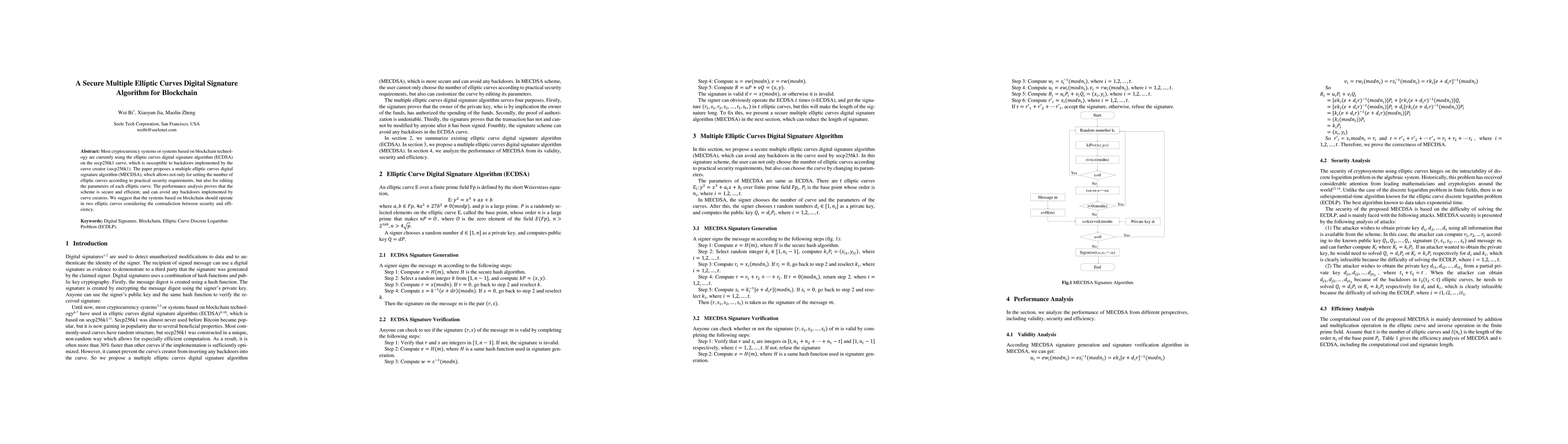 Most cryptocurrency systems or systems based on blockchain technology are currently using the elliptic curves digital signature algorithm (ECDSA) on the secp256k1 curve, which is susceptible to backdoors implemented by the curve creator (secp256k1). The paper proposes a multiple elliptic curves digi-tal signature algorithm (MECDSA), which allows not only for setting the number of elliptic curves according to practical security requirements, but also for editing the parameters of each elliptic curve. The performance analy-sis proves that the scheme is secure and efficient, and can avoid any back-doors implemented by curve creators. We suggest that the systems based on blockchain should operate in two elliptic curves considering the contradic-tion between security and efficiency.