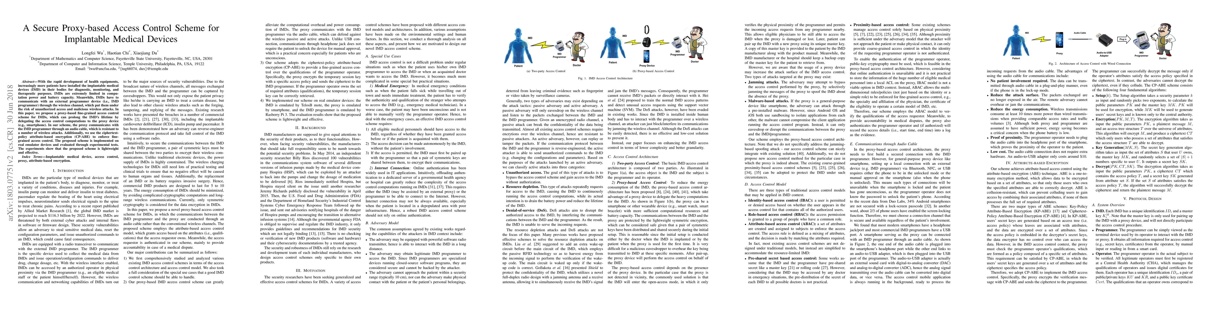 This paper proposes a secure proxy-based access control scheme for implantable medical devices (IMDs) that delegates access control computations to a proxy device to extend IMD lifetime. The scheme uses CP-ABE for fine-grained access control and an audio cable for secure communication, demonstrating effectiveness through experimental tests.