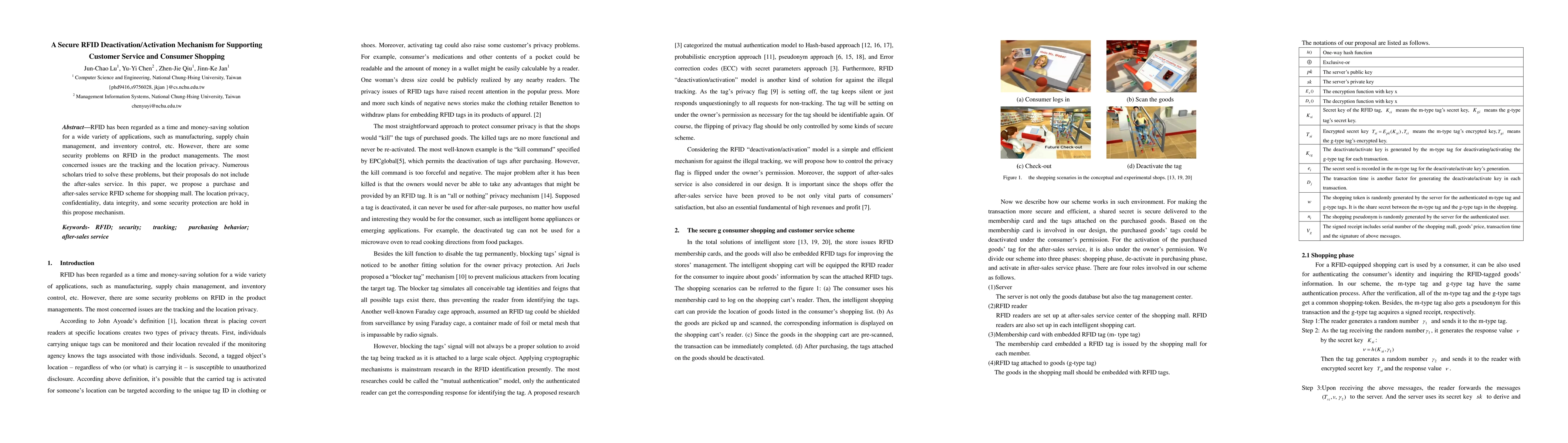 This paper proposes a secure RFID system for shopping malls to protect customer tracking and location privacy while providing after-sales service support. It addresses security concerns such as data integrity and confidentiality in the product management industry.