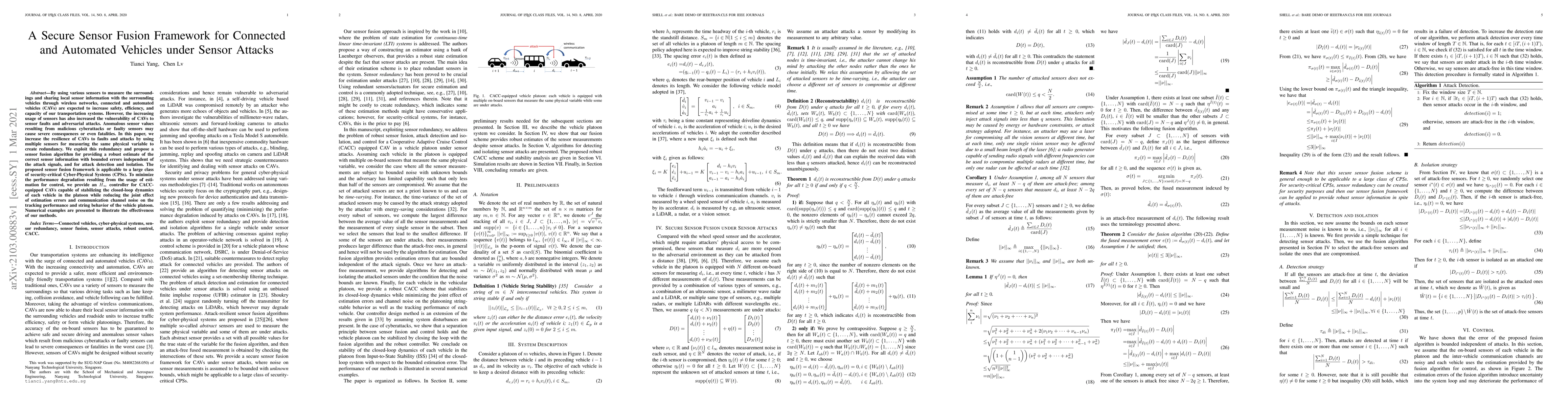 This paper proposes a secure sensor fusion framework to enhance the resilience of connected and automated vehicles (CAVs) against sensor attacks and faults. It utilizes multiple sensors for redundancy and employs an $H_{\infty}$ controller to stabilize vehicle dynamics, ensuring robust performance despite adversarial attacks.
