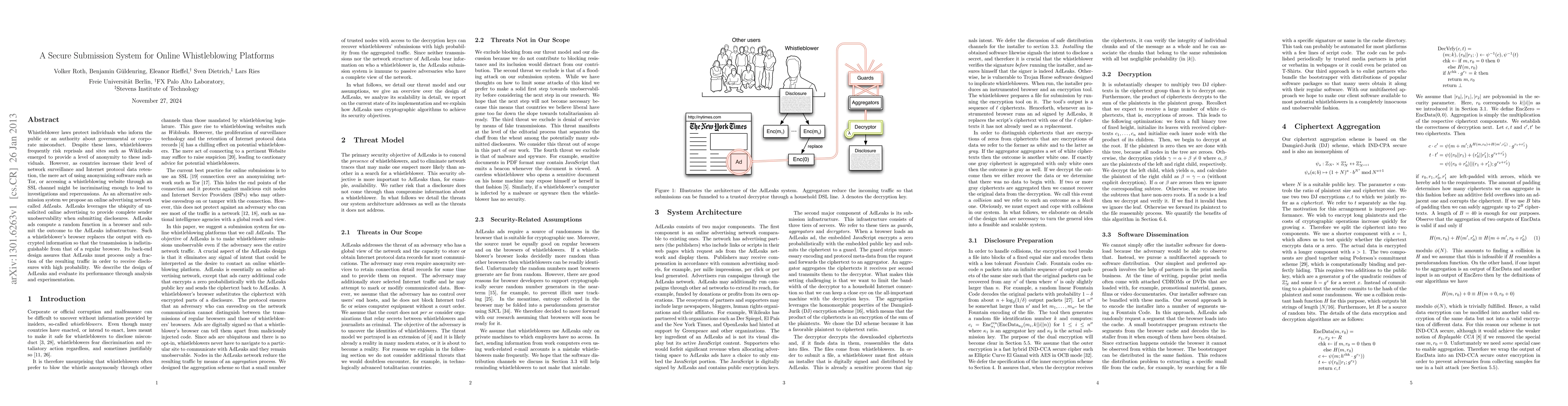 Whistleblower laws protect individuals who inform the public or an authority about governmental or corporate misconduct. Despite these laws, whistleblowers frequently risk reprisals and sites such as WikiLeaks emerged to provide a level of anonymity to these individuals. However, as countries increase their level of network surveillance and Internet protocol data retention, the mere act of using anonymizing software such as Tor, or accessing a whistleblowing website through an SSL channel might be incriminating enough to lead to investigations and repercussions. As an alternative submission system we propose an online advertising network called AdLeaks. AdLeaks leverages the ubiquity of unsolicited online advertising to provide complete sender unobservability when submitting disclosures. AdLeaks ads compute a random function in a browser and submit the outcome to the AdLeaks infrastructure. Such a whistleblower's browser replaces the output with encrypted information so that the transmission is indistinguishable from that of a regular browser. Its back-end design assures that AdLeaks must process only a fraction of the resulting traffic in order to receive disclosures with high probability. We describe the design of AdLeaks and evaluate its performance through analysis and experimentation.