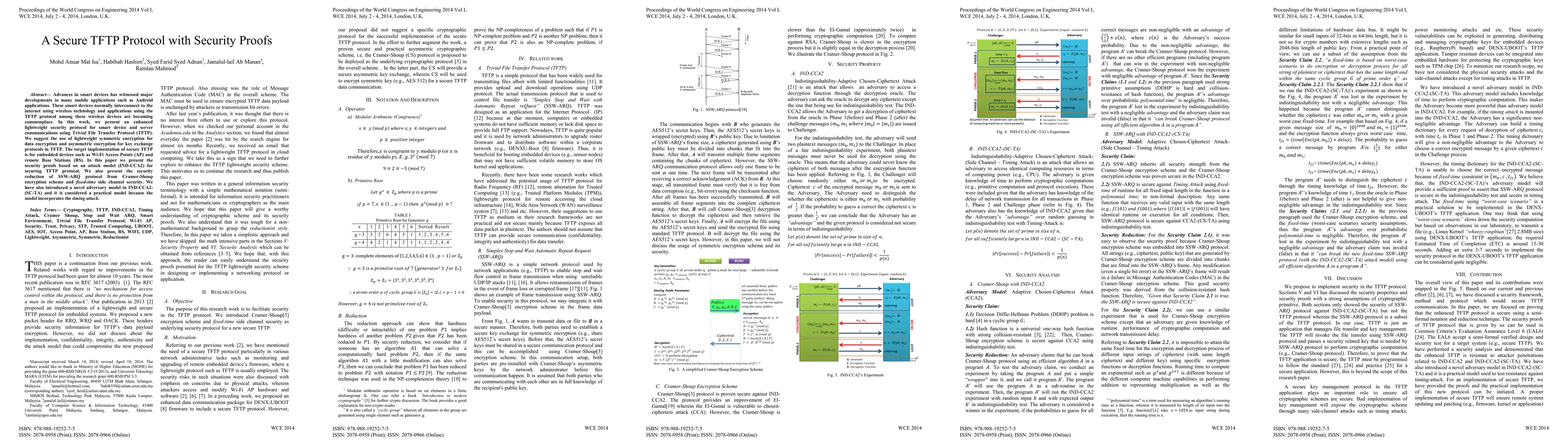 This work stands out by incorporating a timing-attack-aware adversary model (IND-CCA2-(SC-TA)) and providing security proofs for an enhanced TFTP protocol, which is tailored for embedded devices.