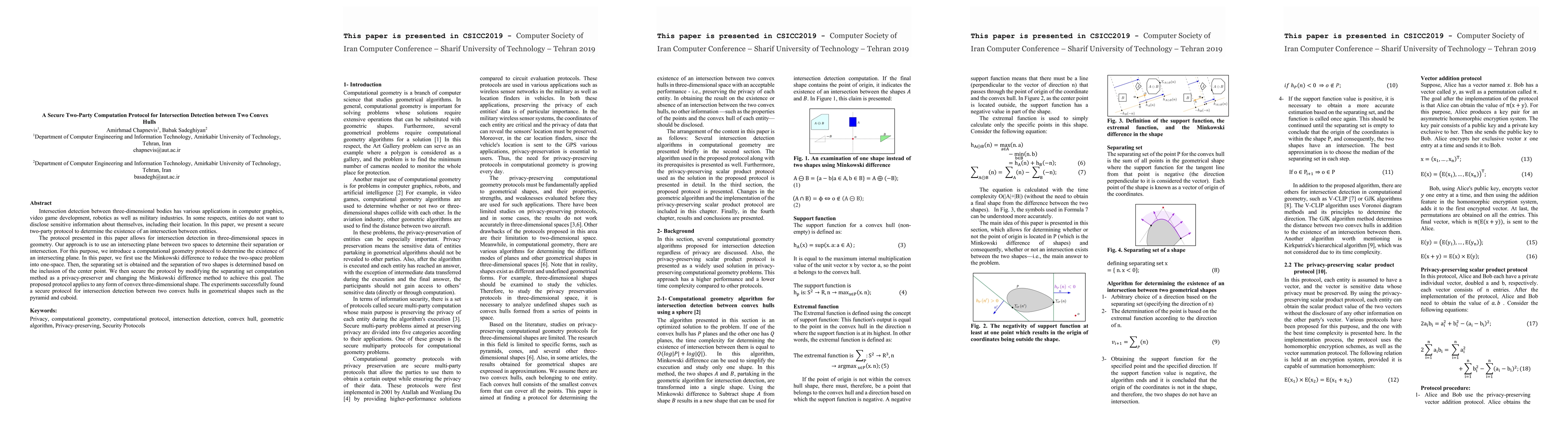 This paper proposes a secure two-party computation protocol to detect intersections between two convex hulls in three-dimensional geometry, utilizing computational geometry techniques like the Minkowski difference and intersecting planes. The protocol ensures privacy by modifying the computation methods, and experiments demonstrate its effectiveness with shapes like pyramids and cuboids.