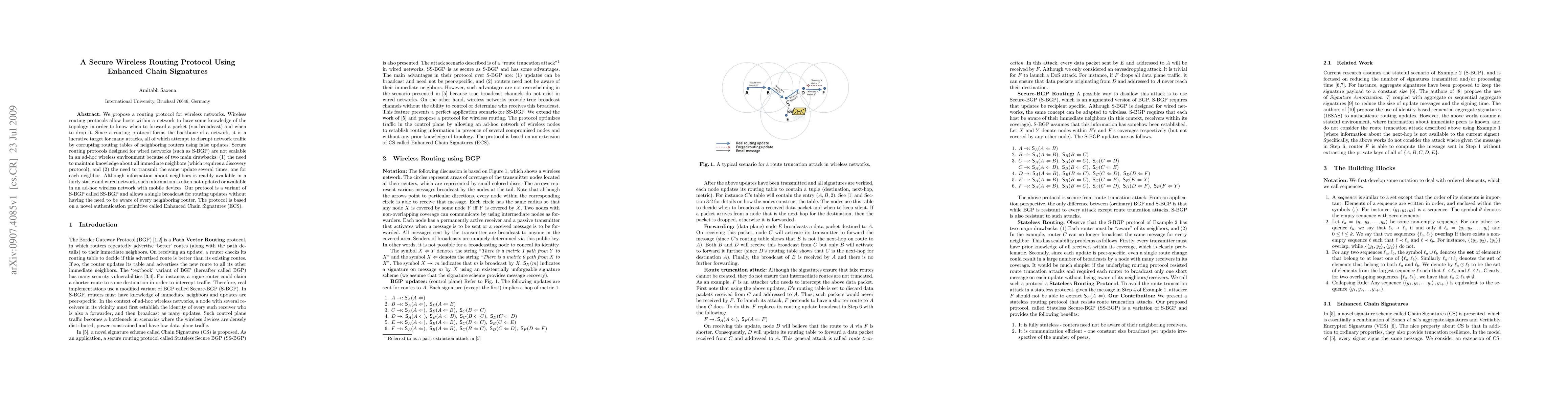 This paper proposes a secure wireless routing protocol, SS-BGP, that utilizes Enhanced Chain Signatures to authenticate routing updates. Unlike traditional protocols, SS-BGP broadcasts routing updates once, eliminating the need for knowledge of all neighboring routers, thus addressing scalability issues in ad-hoc wireless networks.