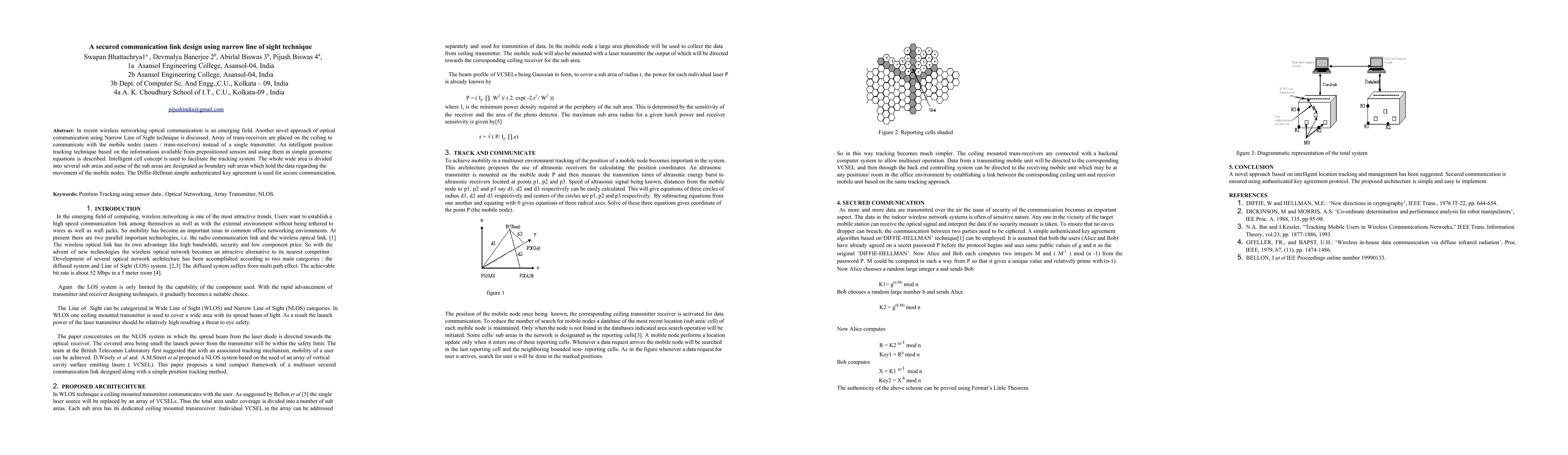 In recent wireless networking optical communication is an emerging field. Another novel approach of optical communication using Narrow Line of Sight technique is discussed. Array of trans receivers are placed on the ceiling to communicate with the mobile nodes (users / trans receivers) instead of a single transmitter. An intelligent position tracking technique based on the informations available from prepositioned sensors and using them in simple geometric equations is described. Intelligent cell concept is used to facilitate the tracking system. The whole wide area is divided into several sub areas and some of the sub areas are designated as boundary sub areas which hold the data regarding the movement of the mobile nodes. The Diffie Hellman simple authenticated key agreement is used for secure communication.