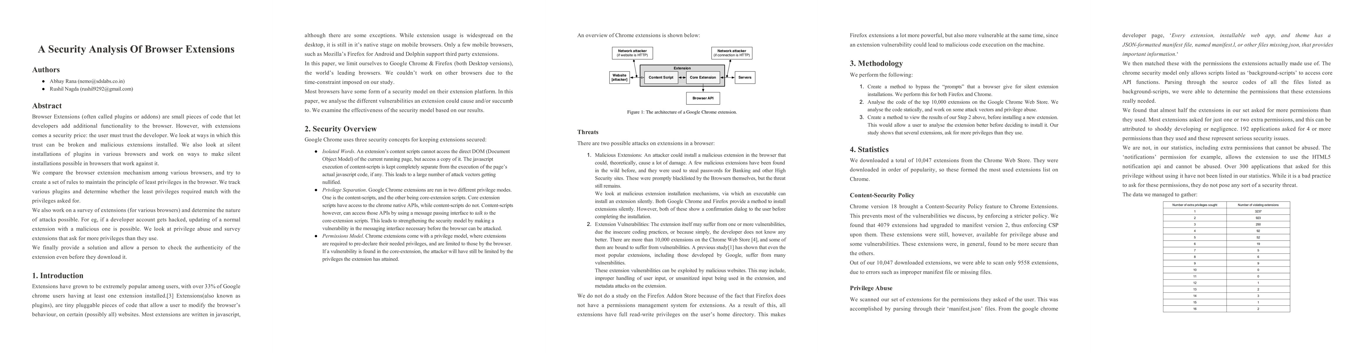 This paper examines the security vulnerabilities of browser extensions, analyzing how malicious extensions can be installed and how silent installations are managed across browsers. It proposes a set of rules to enforce least privileges and surveys extensions to identify privilege abuse, ultimately offering a solution to verify extension authenticity before downloading.
