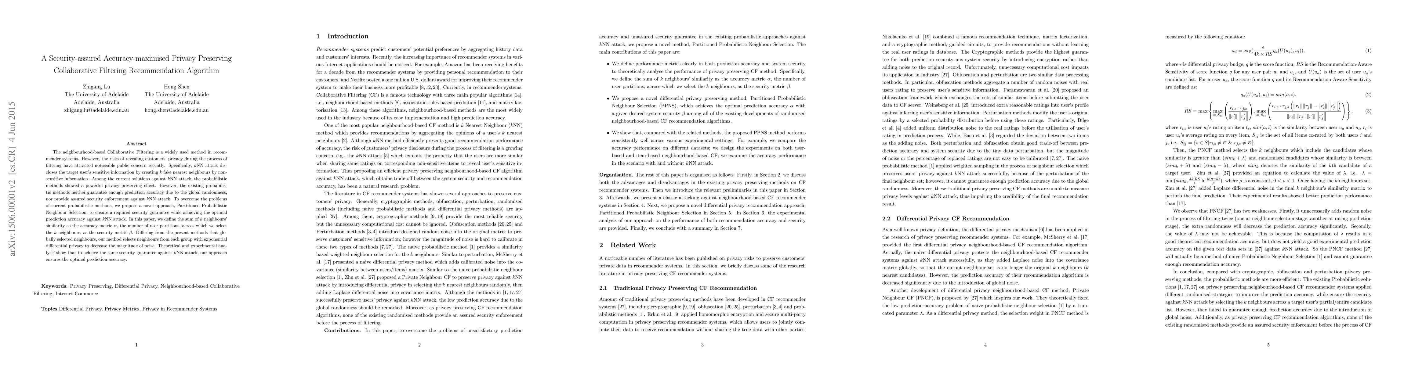 The neighbourhood-based Collaborative Filtering is a widely used method in recommender systems. However, the risks of revealing customers' privacy during the process of filtering have attracted noticeable public concern recently. Specifically, $k$NN attack discloses the target user's sensitive information by creating $k$ fake nearest neighbours by non-sensitive information. Among the current solutions against $k$NN attack, the probabilistic methods showed a powerful privacy preserving effect. However, the existing probabilistic methods neither guarantee enough prediction accuracy due to the global randomness, nor provide assured security enforcement against $k$NN attack. To overcome the problems of current probabilistic methods, we propose a novel approach, Partitioned Probabilistic Neighbour Selection, to ensure a required security guarantee while achieving the optimal prediction accuracy against $k$NN attack. In this paper, we define the sum of $k$ neighbours' similarity as the accuracy metric $\alpha$, the number of user partitions, across which we select the $k$ neighbours, as the security metric $\beta$. Differing from the present methods that globally selected neighbours, our method selects neighbours from each group with exponential differential privacy to decrease the magnitude of noise. Theoretical and experimental analysis show that to achieve the same security guarantee against $k$NN attack, our approach ensures the optimal prediction accuracy.