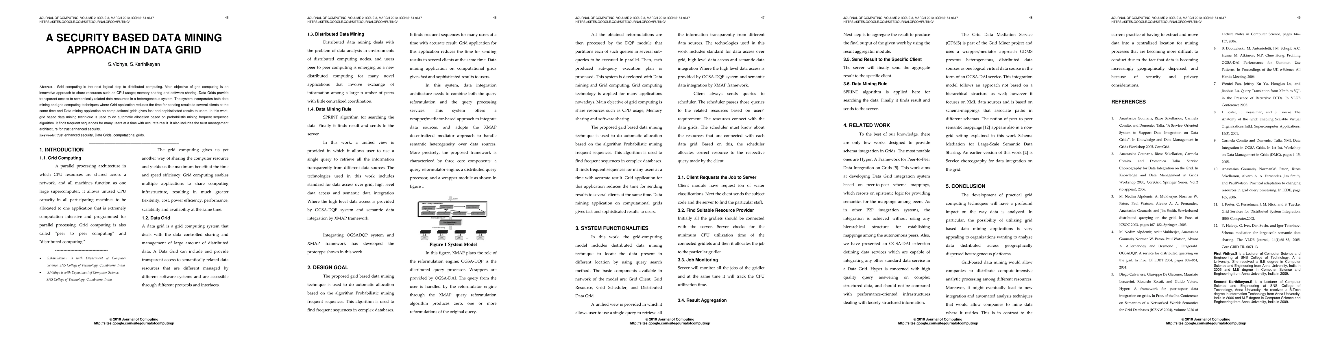 This paper proposes a security-based data mining approach in Data Grids, integrating grid computing and data mining techniques to enhance resource sharing and result delivery efficiency. It employs probabilistic mining for frequent sequence allocation and incorporates a trust management architecture to bolster security.