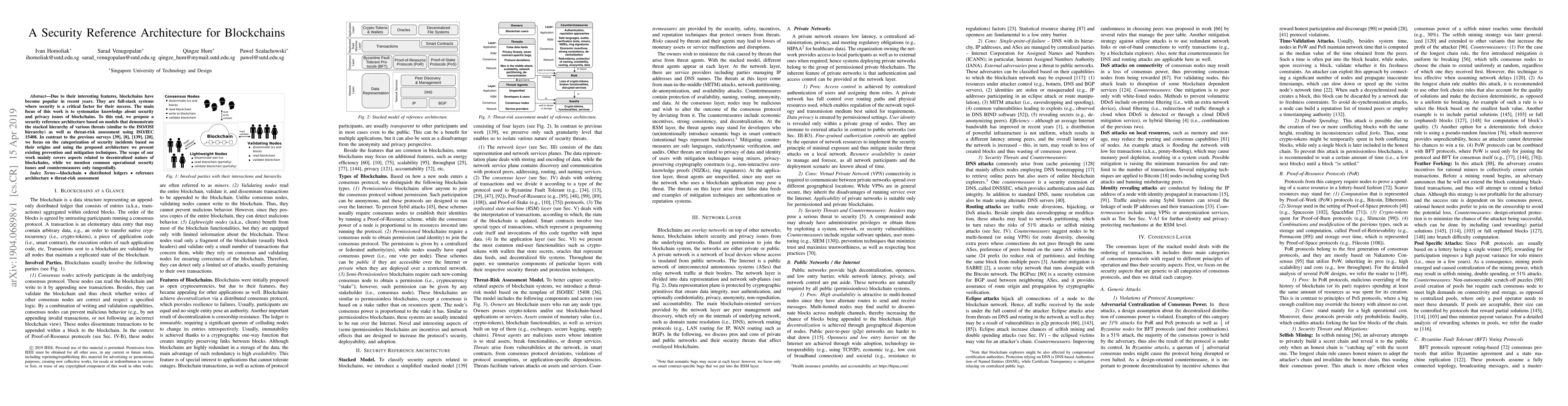 This paper proposes a security reference architecture for blockchains, categorizing security and privacy threats based on their origins. It employs a stacked hierarchy model similar to the ISO/OSI model and uses ISO/IEC 15408 for threat-risk assessment, presenting prevention and mitigation techniques specific to blockchain's decentralized nature.