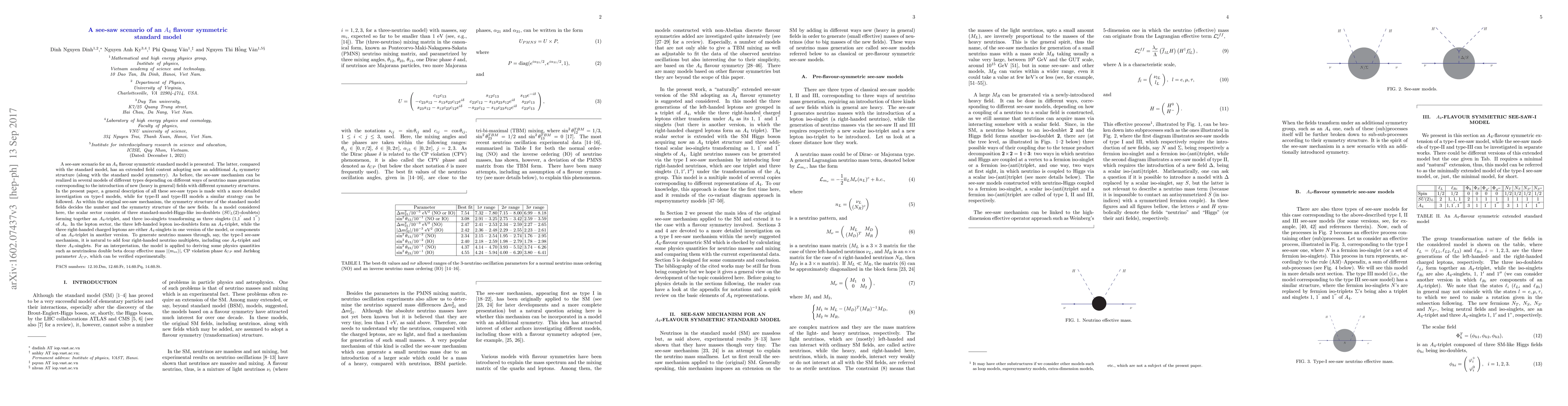 This paper presents an $A_4$ flavour symmetric extension of the Standard Model, incorporating the see-saw mechanism for neutrino mass generation via various types of models. The model includes additional fields and symmetries, and is applied to derive experimental quantities like neutrinoless double beta decay effective mass and CP violation parameters.