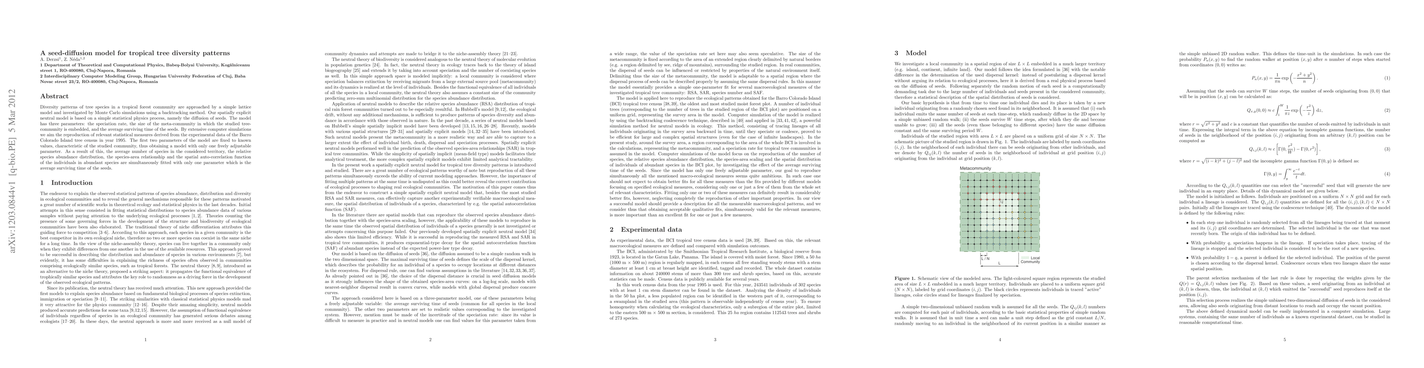 Diversity patterns of tree species in a tropical forest community are approached by a simple lattice model and investigated by Monte Carlo simulations using a backtracking method. Our spatially explicit neutral model is based on a simple statistical physics process, namely the diffusion of seeds. The model has three parameters: the speciation rate, the size of the meta-community in which the studied tree-community is embedded, and the average surviving time of the seeds. By extensive computer simulations we aim the reproduction of relevant statistical measures derived from the experimental data of the Barro Colorado Island tree census in year 1995. The first two parameters of the model are fixed to known values, characteristic of the studied community, thus obtaining a model with only one freely adjustable parameter. As a result of this, the average number of species in the considered territory, the relative species abundance distribution, the species-area relationship and the spatial auto-correlation function of the individuals in abundant species are simultaneously fitted with only one parameter which is the average surviving time of the seeds.