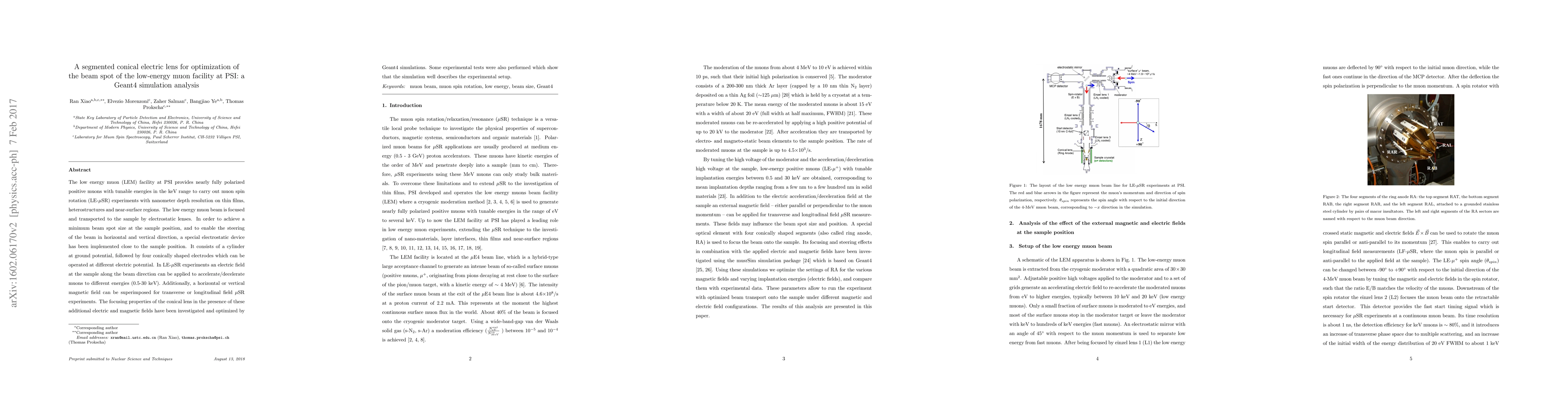 This paper presents a segmented conical electric lens designed to optimize the beam spot size for low-energy muon experiments at PSI, utilizing Geant4 simulations to analyze and refine its focusing properties under various electric and magnetic fields. Experimental validation confirms the accuracy of the simulation results.