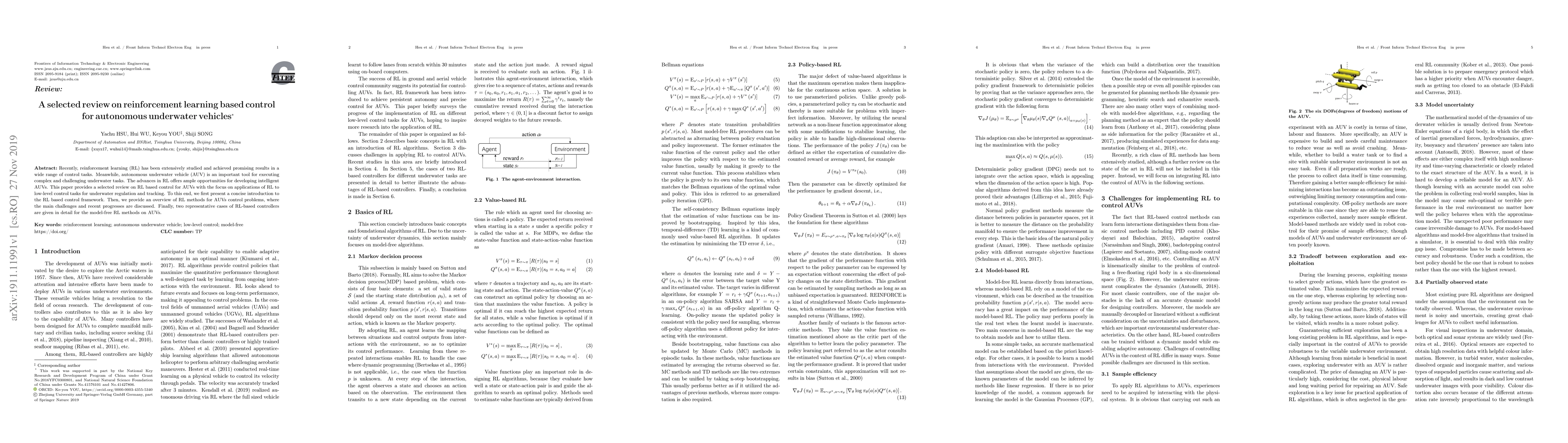 This paper reviews reinforcement learning (RL) applications for controlling autonomous underwater vehicles (AUVs), focusing on RL-based solutions for low-level control tasks. It discusses RL methods, challenges, and recent progress, and provides detailed examples of model-free RL controllers for AUVs.