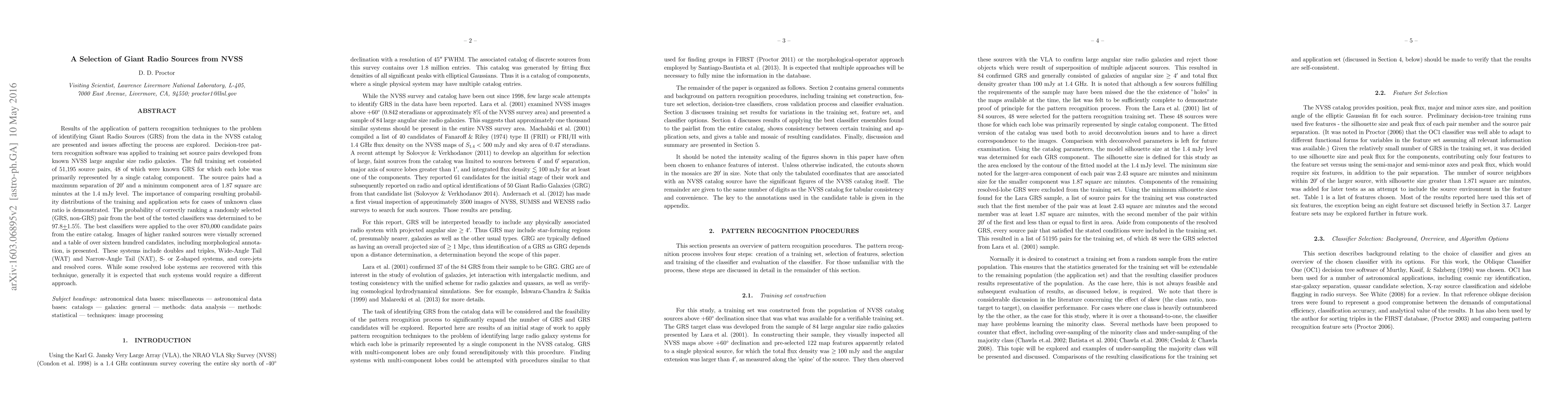 Results of the application of pattern recognition techniques to the problem of identifying Giant Radio Sources (GRS) from the data in the NVSS catalog are presented and issues affecting the process are explored. Decision-tree pattern recognition software was applied to training set source pairs developed from known NVSS large angular size radio galaxies. The full training set consisted of 51,195 source pairs, 48 of which were known GRS for which each lobe was primarily represented by a single catalog component. The source pairs had a maximum separation of 20 arc minutes and a minimum component area of 1.87 square arc minutes at the 1.4 mJy level. The importance of comparing resulting probability distributions of the training and application sets for cases of unknown class ratio is demonstrated. The probability of correctly ranking a randomly selected (GRS, non-GRS) pair from the best of the tested classifiers was determined to be 97.8 +/- 1.5%. The best classifiers were applied to the over 870,000 candidate pairs from the entire catalog. Images of higher ranked sources were visually screened and a table of over sixteen hundred candidates, including morphological annotation, is presented. These systems include doubles and triples, Wide-Angle Tail (WAT) and Narrow-Angle Tail (NAT), S- or Z-shaped systems, and core-jets and resolved cores. While some resolved lobe systems are recovered with this technique, generally it is expected that such systems would require a different approach.