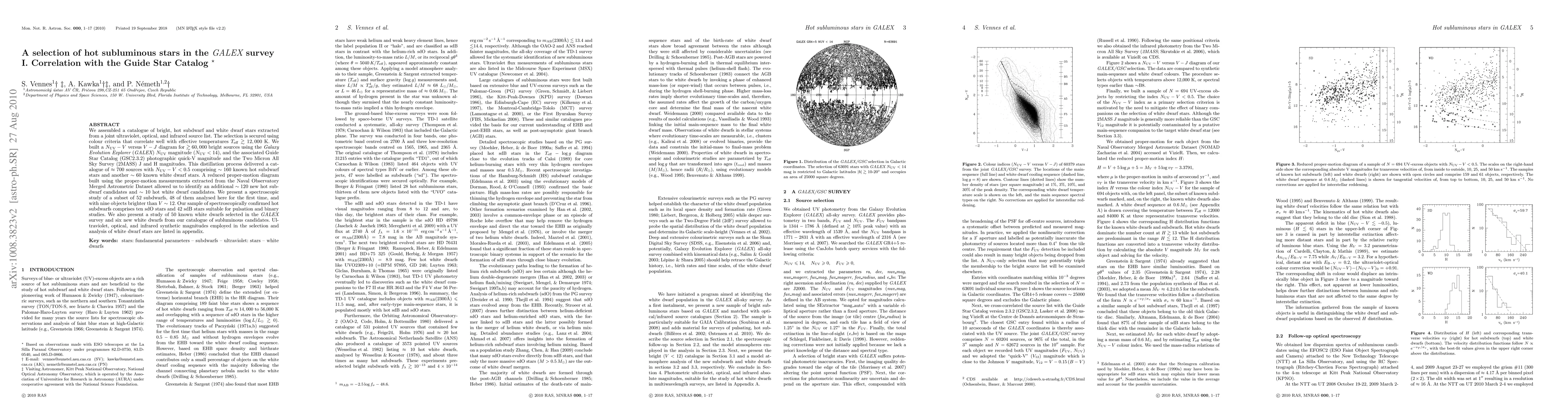 This paper catalogs hot subluminous stars (subdwarfs and white dwarfs) from the GALEX survey, correlating them with the Guide Star Catalog. It identifies ~160 known hot subdwarfs and ~60 known white dwarfs, along with ~120 new subdwarf and ~10 new white dwarf candidates, and presents spectroscopic studies of a subset.