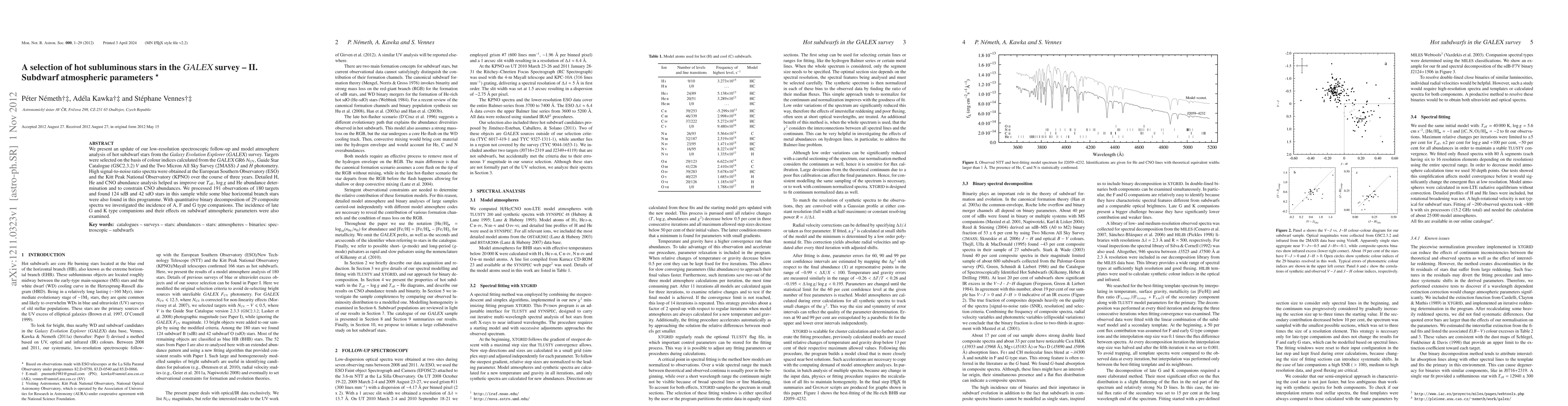 This paper updates spectroscopic follow-up and model atmosphere analysis of hot subluminous stars from the GALEX survey, revealing 124 sdB and 42 sdO stars. It investigates the atmospheric parameters and binary companions of these stars, with a focus on H, He, and CNO abundances.