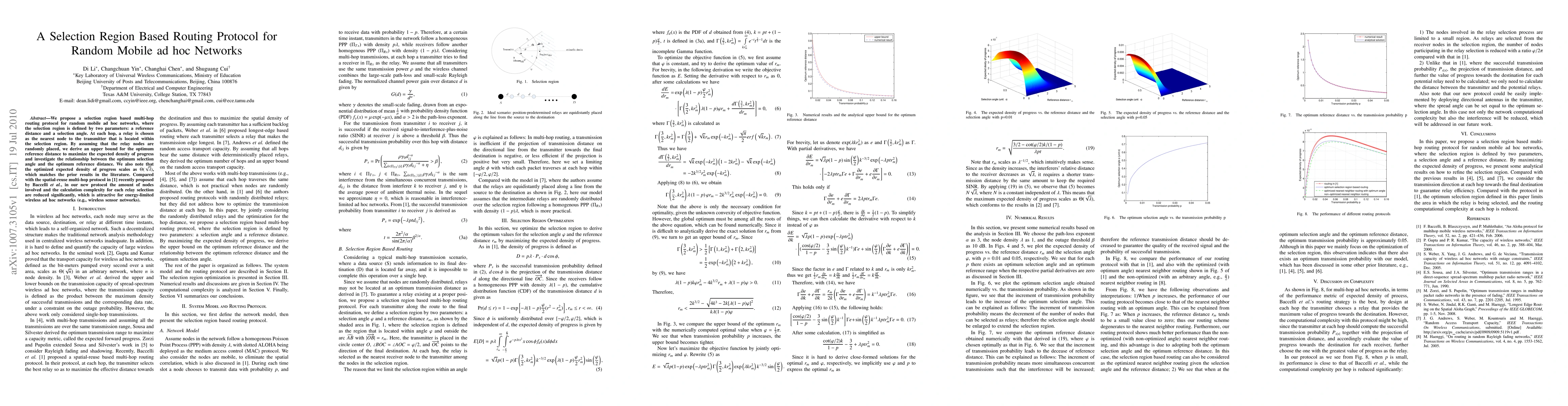 This paper proposes a new selection region based multi-hop routing protocol for random mobile ad hoc networks, optimizing relay selection within a defined region to maximize progress density. The protocol reduces node involvement and calculation complexity compared to existing methods, making it suitable for energy-constrained networks like wireless sensor networks.