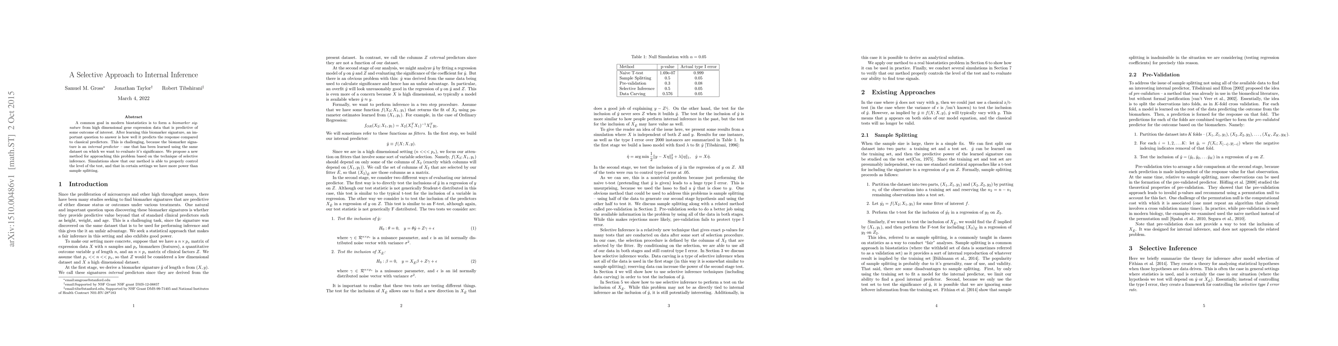 A common goal in modern biostatistics is to form a biomarker signature from high dimensional gene expression data that is predictive of some outcome of interest. After learning this biomarker signature, an important question to answer is how well it predicts the response compared to classical predictors. This is challenging, because the biomarker signature is an internal predictor -- one that has been learned using the same dataset on which we want to evaluate it's significance. We propose a new method for approaching this problem based on the technique of selective inference. Simulations show that our method is able to properly control the level of the test, and that in certain settings we have more power than sample splitting.