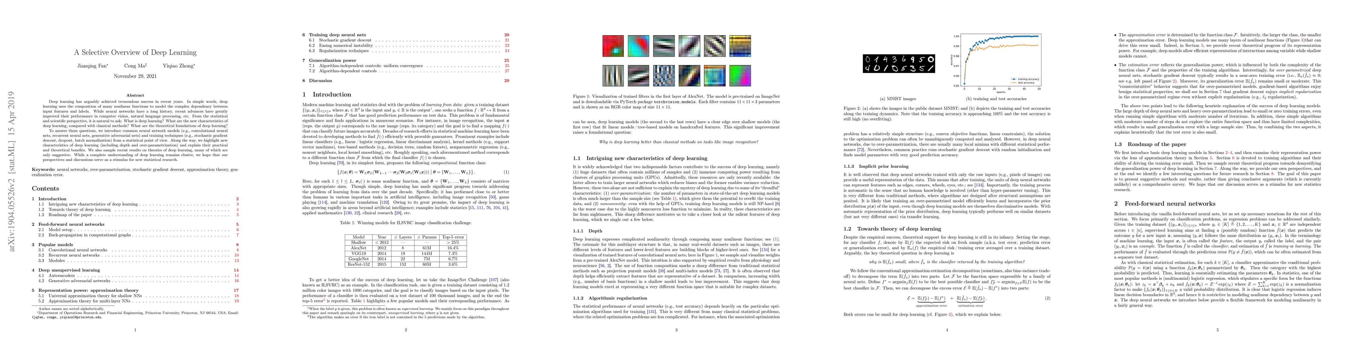 Deep learning has arguably achieved tremendous success in recent years. In simple words, deep learning uses the composition of many nonlinear functions to model the complex dependency between input features and labels. While neural networks have a long history, recent advances have greatly improved their performance in computer vision, natural language processing, etc. From the statistical and scientific perspective, it is natural to ask: What is deep learning? What are the new characteristics of deep learning, compared with classical methods? What are the theoretical foundations of deep learning? To answer these questions, we introduce common neural network models (e.g., convolutional neural nets, recurrent neural nets, generative adversarial nets) and training techniques (e.g., stochastic gradient descent, dropout, batch normalization) from a statistical point of view. Along the way, we highlight new characteristics of deep learning (including depth and over-parametrization) and explain their practical and theoretical benefits. We also sample recent results on theories of deep learning, many of which are only suggestive. While a complete understanding of deep learning remains elusive, we hope that our perspectives and discussions serve as a stimulus for new statistical research.