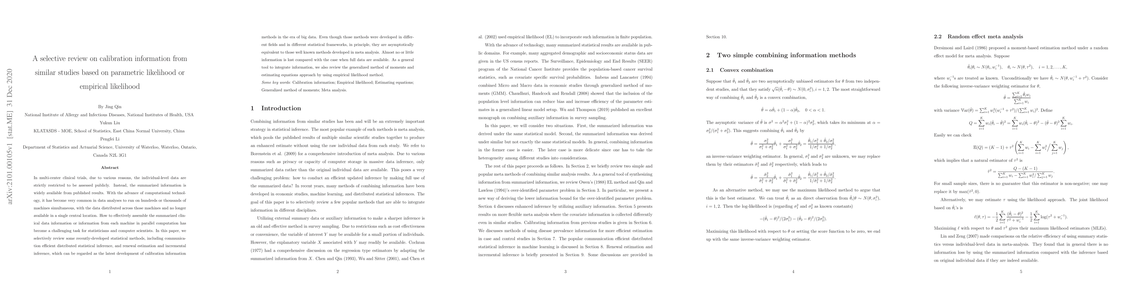 In multi-center clinical trials, due to various reasons, the individual-level data are strictly restricted to be assessed publicly. Instead, the summarized information is widely available from published results. With the advance of computational technology, it has become very common in data analyses to run on hundreds or thousands of machines simultaneous, with the data distributed across those machines and no longer available in a single central location. How to effectively assemble the summarized clinical data information or information from each machine in parallel computation has become a challenging task for statisticians and computer scientists. In this paper, we selectively review some recently-developed statistical methods, including communication efficient distributed statistical inference, and renewal estimation and incremental inference, which can be regarded as the latest development of calibration information methods in the era of big data. Even though those methods were developed in different fields and in different statistical frameworks, in principle, they are asymptotically equivalent to those well known methods developed in meta analysis. Almost no or little information is lost compared with the case when full data are available. As a general tool to integrate information, we also review the generalized method of moments and estimating equations approach by using empirical likelihood method.