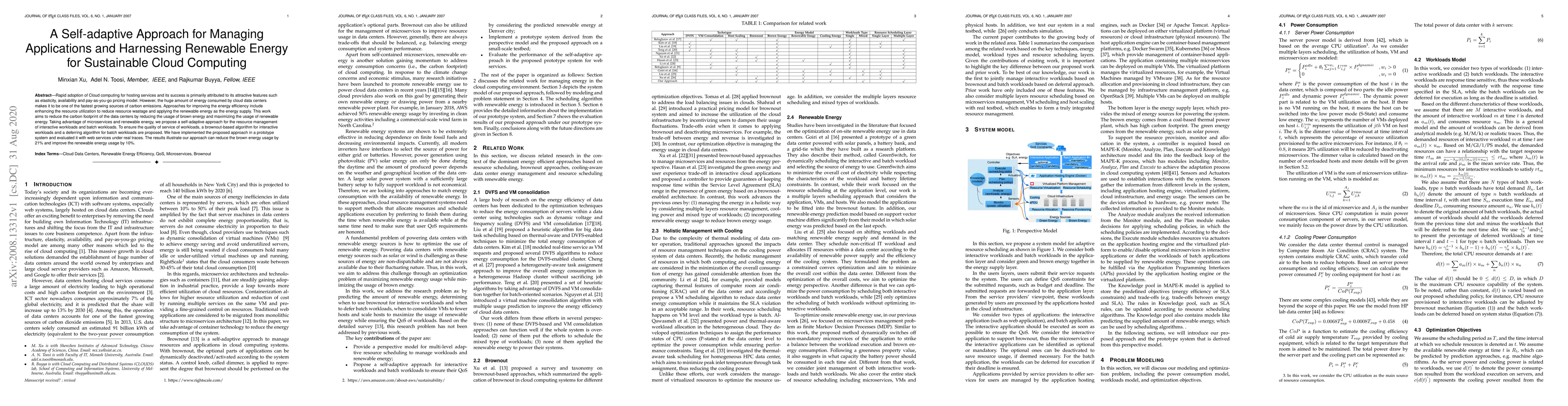 A self-adaptive approach for managing cloud computing resources reduces carbon emissions by 21% and increases renewable energy usage by 10%. It uses microservices to optimize resource utilization and quality of service for interactive and batch workloads.