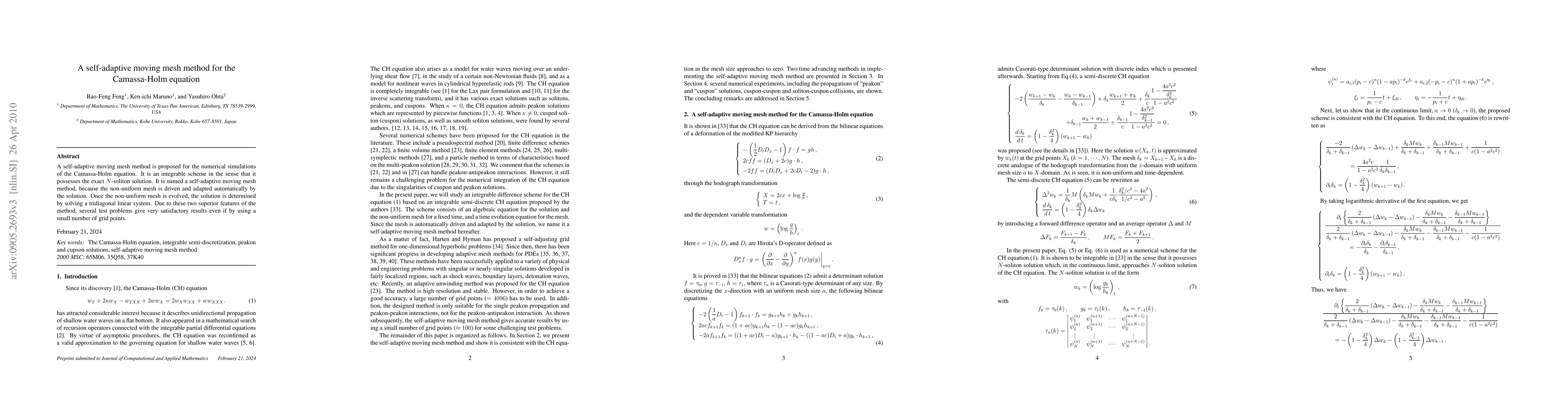 This paper proposes a self-adaptive moving mesh method for the Camassa-Holm equation, featuring an exact N-soliton solution and automatic mesh adaptation driven by the solution, achieving satisfactory results with minimal grid points.