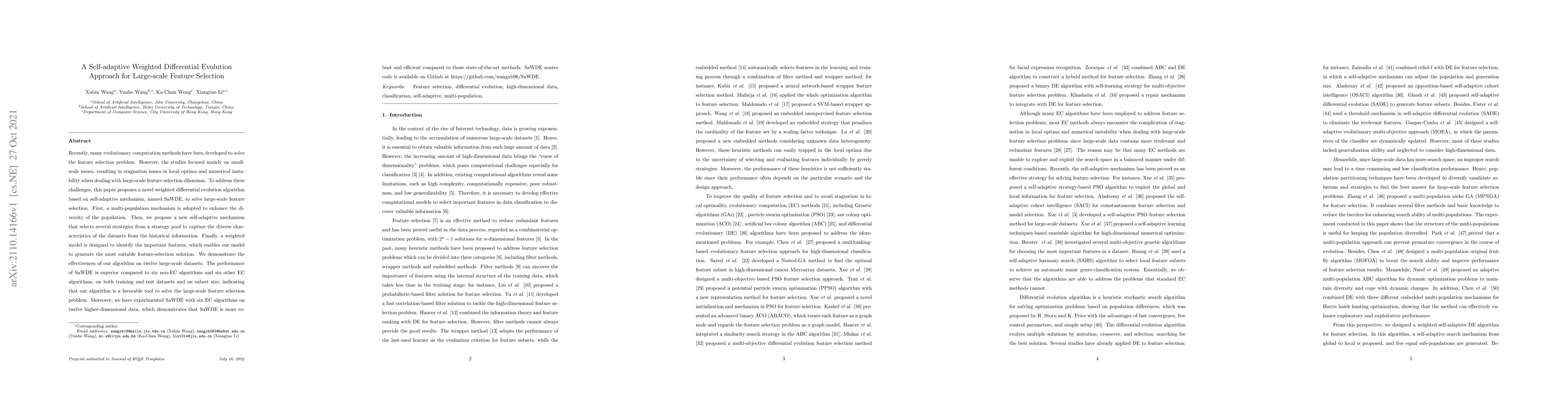 A novel self-adaptive weighted differential evolution algorithm (SaWDE) is proposed to solve large-scale feature selection problems, outperforming other algorithms in terms of robustness and efficiency.