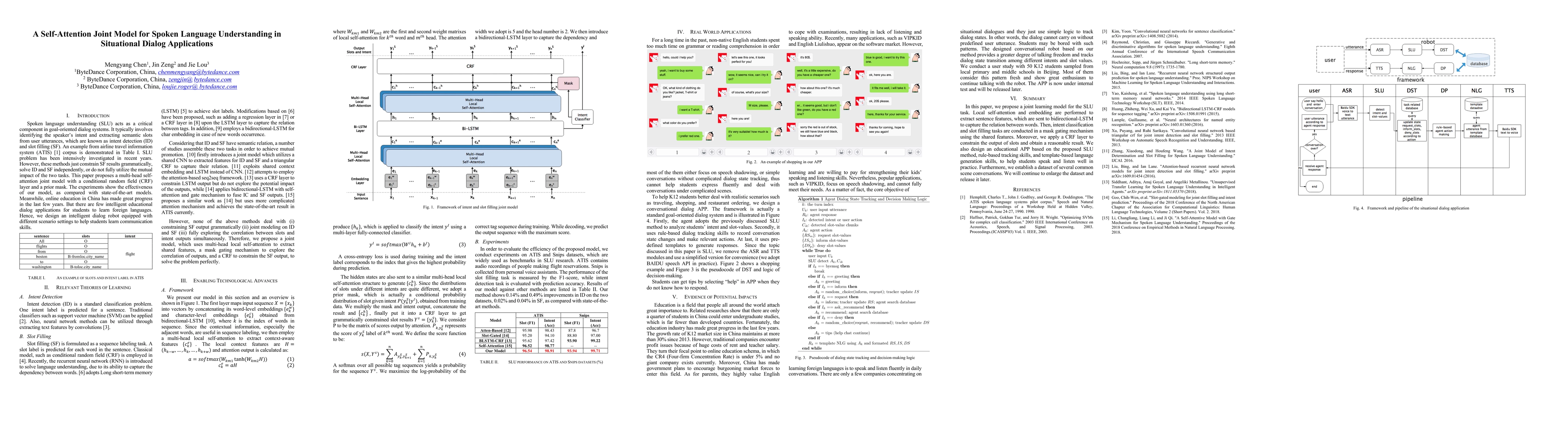 This paper proposes a self-attention joint model for spoken language understanding, integrating intent detection and slot filling tasks to better capture their mutual impact. The model, enhanced with a CRF layer and a prior mask, outperforms existing methods, and is applied in an intelligent dialog robot for language learning in online education.