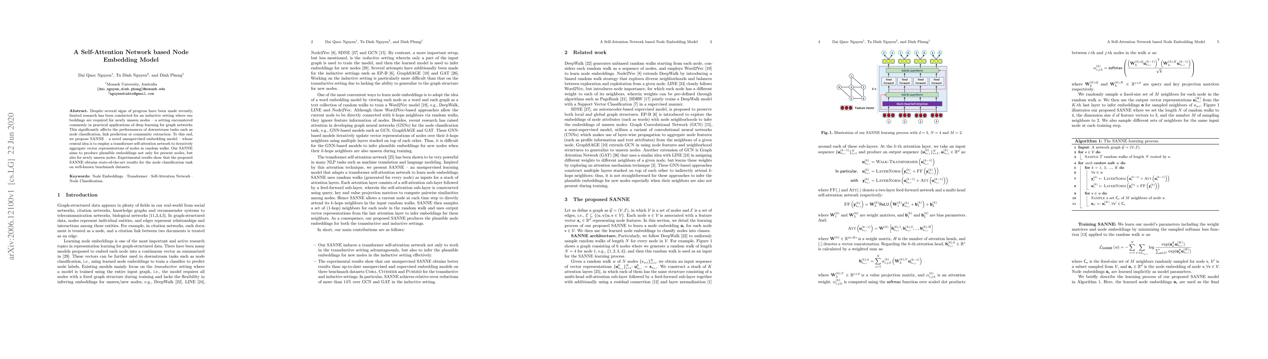 The paper proposes SANNE, an unsupervised node embedding model using a transformer self-attention network to iteratively aggregate representations from random walks, enabling effective embedding for both seen and unseen nodes. Experimental results demonstrate SANNE's superior performance in node classification on benchmark datasets.