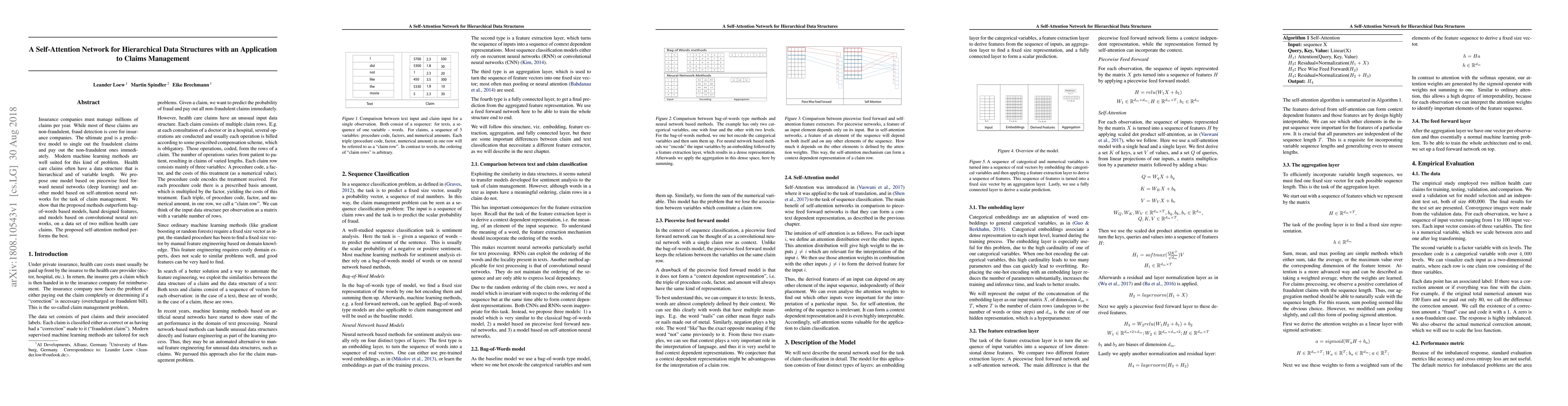 Insurance companies must manage millions of claims per year. While most of these claims are non-fraudulent, fraud detection is core for insurance companies. The ultimate goal is a predictive model to single out the fraudulent claims and pay out the non-fraudulent ones immediately. Modern machine learning methods are well suited for this kind of problem. Health care claims often have a data structure that is hierarchical and of variable length. We propose one model based on piecewise feed forward neural networks (deep learning) and another model based on self-attention neural networks for the task of claim management. We show that the proposed methods outperform bag-of-words based models, hand designed features, and models based on convolutional neural networks, on a data set of two million health care claims. The proposed self-attention method performs the best.