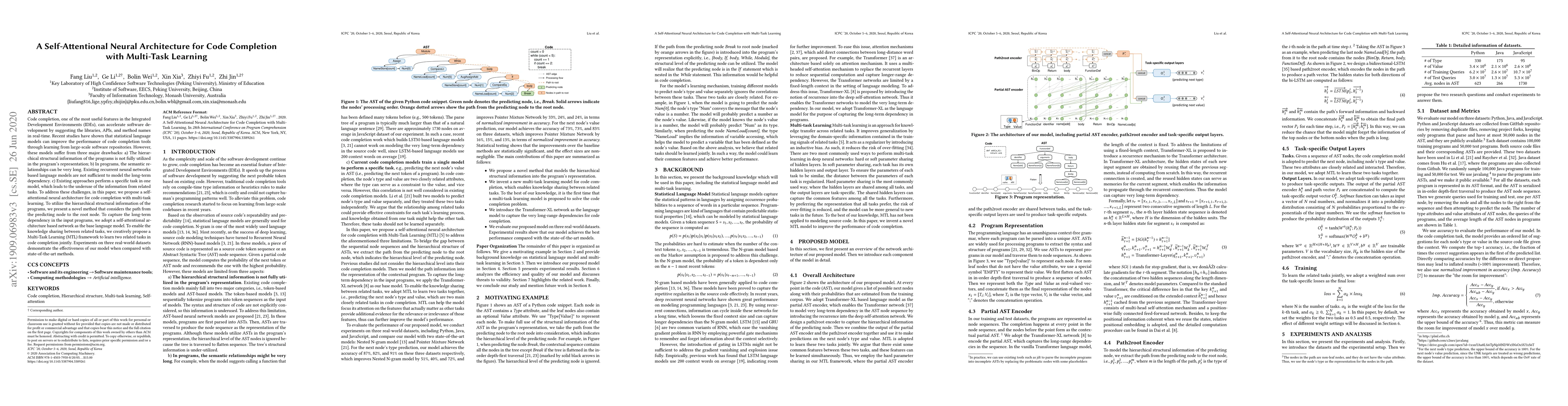 This paper proposes a self-attentional neural architecture for code completion that leverages multi-task learning to address the limitations of existing models, including inadequate structural information utilization, long-term dependency modeling, and task-specific information underuse. The proposed model demonstrates superior performance on real-world datasets.