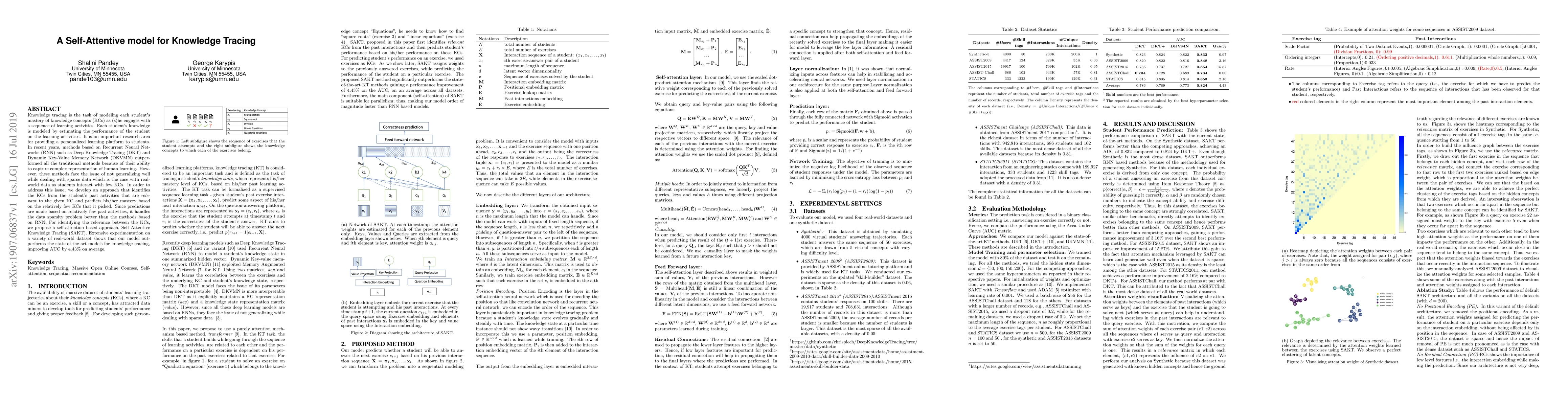 The paper proposes a Self Attentive Knowledge Tracing (SAKT) model to address the data sparsity issue in knowledge tracing using self-attention to identify relevant knowledge concepts from past student activities, outperforming state-of-the-art RNN-based methods by improving the average AUC by 4.43%.