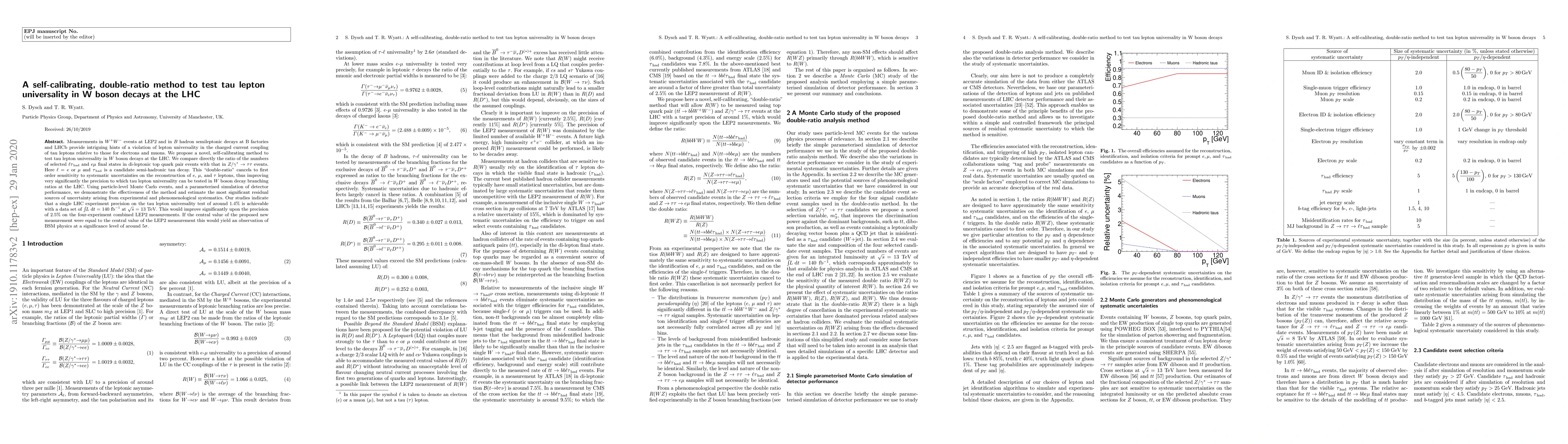 Measurements in $W^+W^-$ events at LEP2 and in $B$ hadron semileptonic decays at B factories and LHCb provide intriguing hints of a violation of lepton universality in the charged current coupling of tau leptons relative to those for electrons and muons. We propose a novel, self-calibrating method to test tau lepton universality in $W$ boson decays at the LHC. We compare directly the ratio of the numbers of selected $\ell-\tau$ and $e-\mu$ final states in di-leptonic $tt$ events with that in $Z/\gamma^*\rightarrow\tau^+\tau^-$ events. Here $\ell=e$ or $\mu$ and $\tau$ is a candidate semi-hadronic tau decay. This "double-ratio" cancels to first order sensitivity to systematic uncertainties on the reconstruction of $e$, $\mu$, and $\tau$ leptons, thus improving very significantly the precision to which tau lepton universality can be tested in $W$ boson decay branching ratios at the LHC. Using particle-level Monte Carlo events, and a parameterised simulation of detector performance, we demonstrate the effectiveness of the method and estimate the most significant residual sources of uncertainty arising from experimental and phenomenological systematics. Our studies indicate that a single experiment precision on the tau lepton universality test of around 1.4% is achievable with a data set of 140 fb$^{-1}$ at $\sqrt{s}$ = 13 TeV. This would improve significantly upon the precision of 2.5% on the four-experiment combined LEP2 measurements. If the central value of the proposed new measurement were equal to the central value of the LEP2 measurement this would yield an observation of BSM physics at a significance level of around 5 $\sigma$.