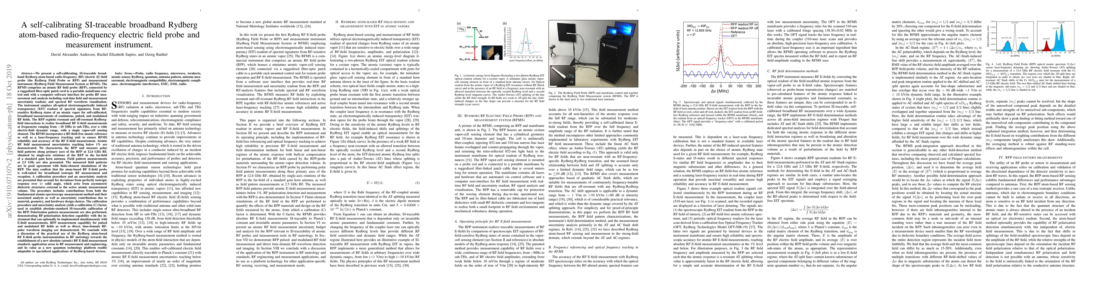 This paper introduces a self-calibrating, SI-traceable broadband radio-frequency electric field probe based on Rydberg atoms, capable of measuring frequencies from ~10 MHz to sub-THz. The system, comprising an atomic RF probe and a control unit, employs electromagnetically induced transparency for accurate RF field measurements, validated through calibration and uncertainty analysis.
