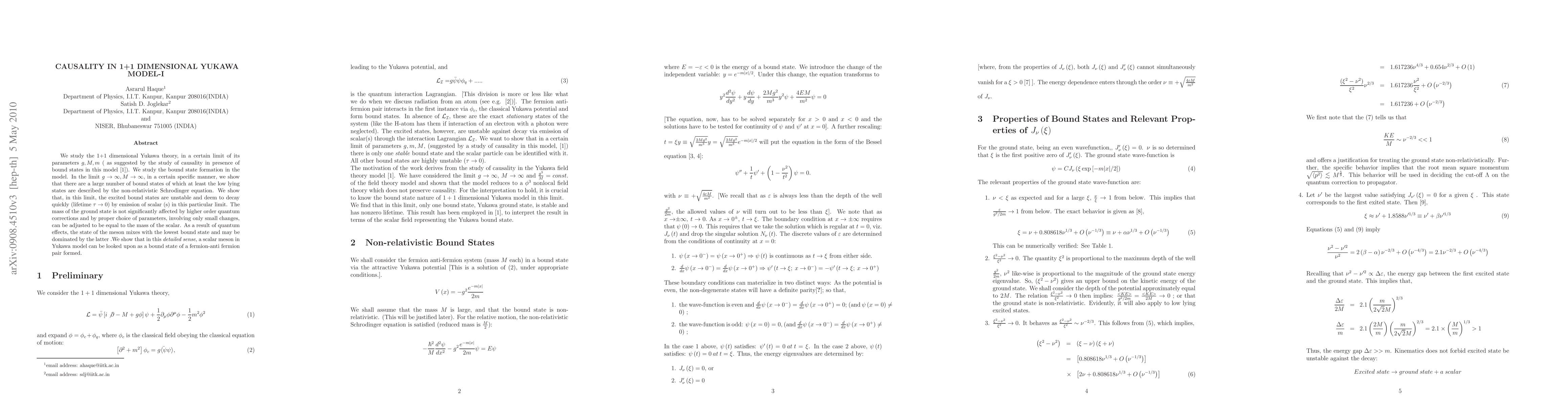 We study the 1+1 dimensional Yukawa theory, in a certain limit of its parameters g,M,m (as suggested by the study of causality in presence of bound states in this model). We study the bound state formation in the model. In the limit $g\to\infty,M\to\infty$, in a certain specific manner, we show that there are a large number of bound states of which at least the low lying states are described by the non-relativistic Schrodinger equation. We show that, in this limit, the excited bound states are unstable and deem to decay quickly (lifetime $\tau\to 0 $) by emission of scalar (s) in this particular limit. The mass of the ground state is not significantly affected by higher order quantum corrections and by proper choice of parameters, involving only small changes, can be adjusted to be equal to the mass of the scalar. As a result of quantum effects, the state of the meson mixes with the lowest bound state and may be dominated by the latter .We show that in this detailed sense, a scalar meson in Yukawa model can be looked upon as a bound state of a fermion-anti fermion pair formed.