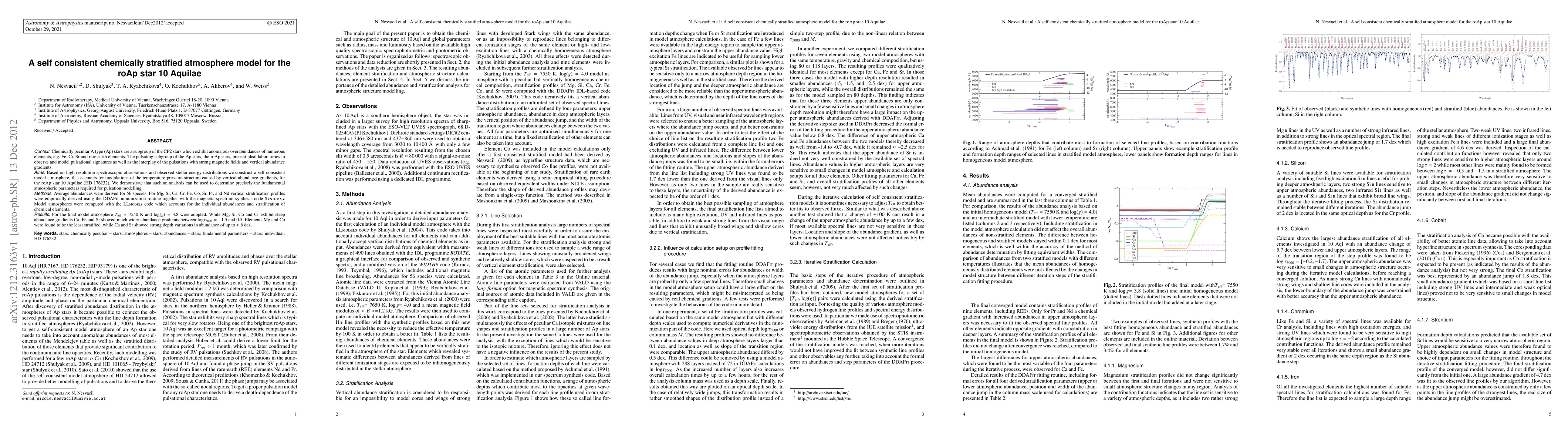 This paper constructs a self-consistent model atmosphere for the roAp star 10 Aquilae, accounting for vertical abundance gradients and magnetic fields. The model, derived from high-resolution spectroscopy, reveals significant stratification in elements like Ca and Sr, aiding in precise determination of atmospheric parameters for pulsation modeling.
