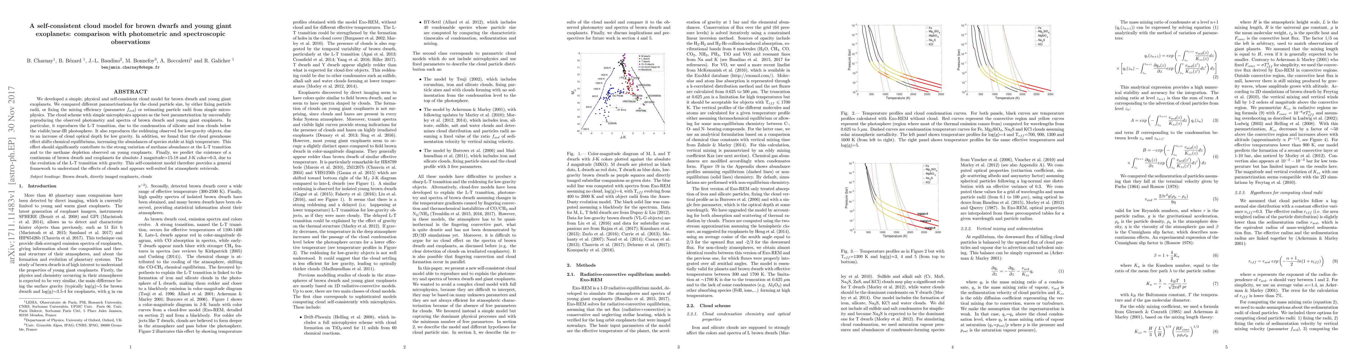 This paper presents a self-consistent cloud model for brown dwarfs and young giant exoplanets, showing that a cloud scheme based on simple microphysics best fits observed photometric and spectroscopic data. The model explains the L-T transition and reddening effects, and predicts a continuum of brown dwarfs and exoplanets in specific magnitude and color ranges.