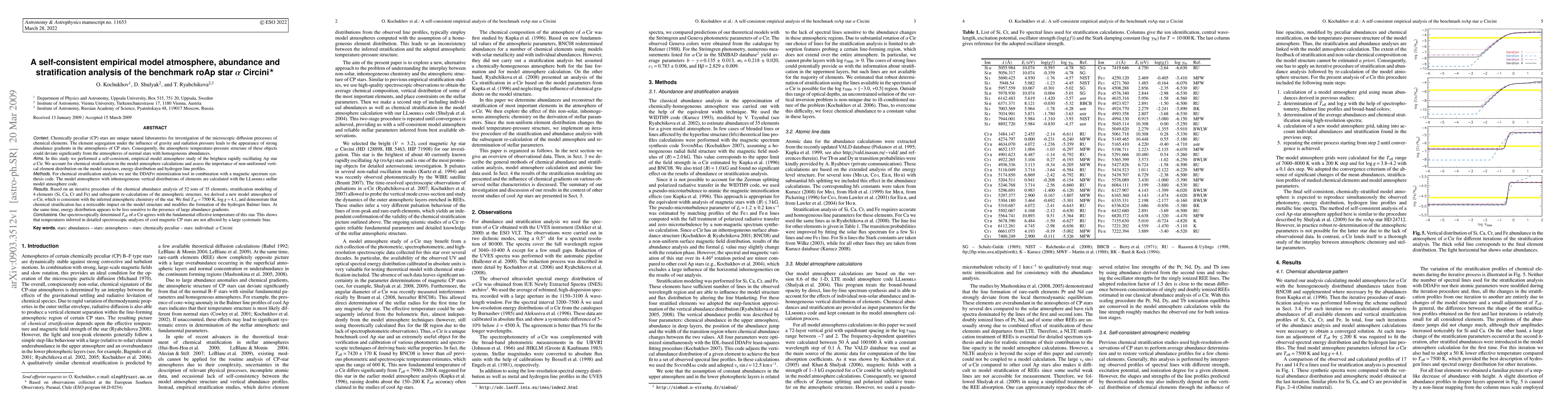 This paper develops a self-consistent empirical model atmosphere for the roAp star alpha Circini, accounting for chemical stratification. The study finds that non-uniform vertical element distribution significantly impacts the atmospheric structure and hydrogen line profiles, with Teff=7500 K and logg=4.1, confirming the absence of large systematic bias in spectroscopically inferred temperatures.