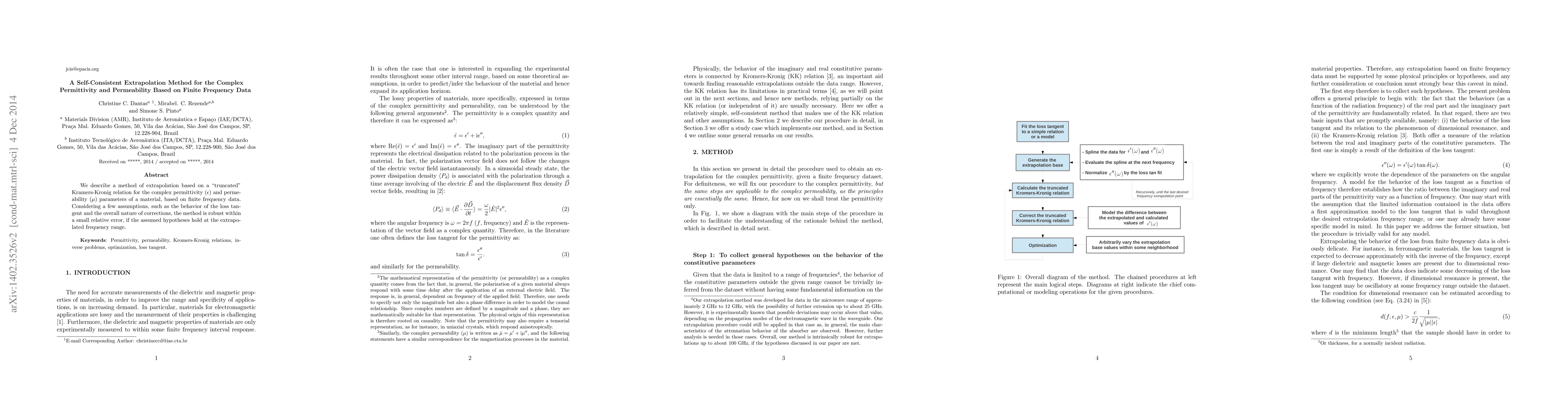This paper introduces a self-consistent extrapolation method for determining complex permittivity and permeability based on finite frequency data using a truncated Kramers-Kronig relation. The method is robust within a small relative error, provided the assumptions about loss tangent behavior and correction nature hold true in the extrapolated frequency range.