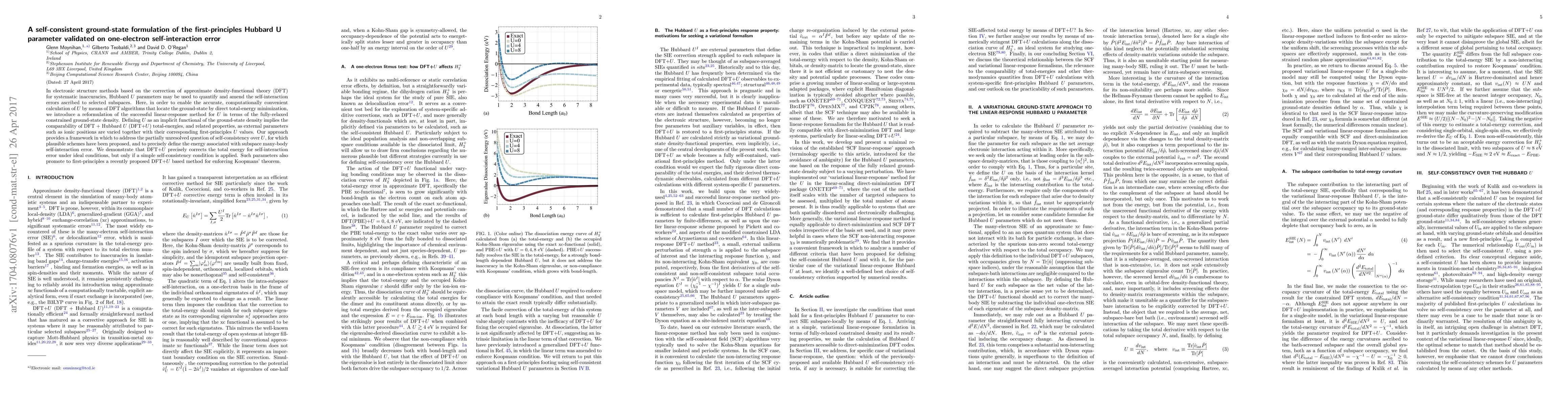 In electronic structure methods based on the correction of approximate density-functional theory (DFT) for systematic inaccuracies, Hubbard $U$ parameters may be used to quantify and amend the self-interaction errors ascribed to selected subspaces. Here, in order to enable the accurate, computationally convenient calculation of $U$ by means of DFT algorithms that locate the ground-state by direct total-energy minimization, we introduce a reformulation of the successful linear-response method for $U$ in terms of the fully-relaxed constrained ground-state density. Defining $U$ as an implicit functional of the ground-state density implies the comparability of DFT + Hubbard $U$ (DFT+$U$) total-energies, and related properties, as external parameters such as ionic positions are varied together with their corresponding first-principles $U$ values. Our approach provides a framework in which to address the partially unresolved question of self-consistency over $U$, for which plausible schemes have been proposed, and to precisely define the energy associated with subspace many-body self-interaction error. We demonstrate that DFT+$U$ precisely corrects the total energy for self-interaction error under ideal conditions, but only if a simple self-consistency condition is applied. Such parameters also promote to first-principles a recently proposed DFT+$U$ based method for enforcing Koopmans' theorem.
