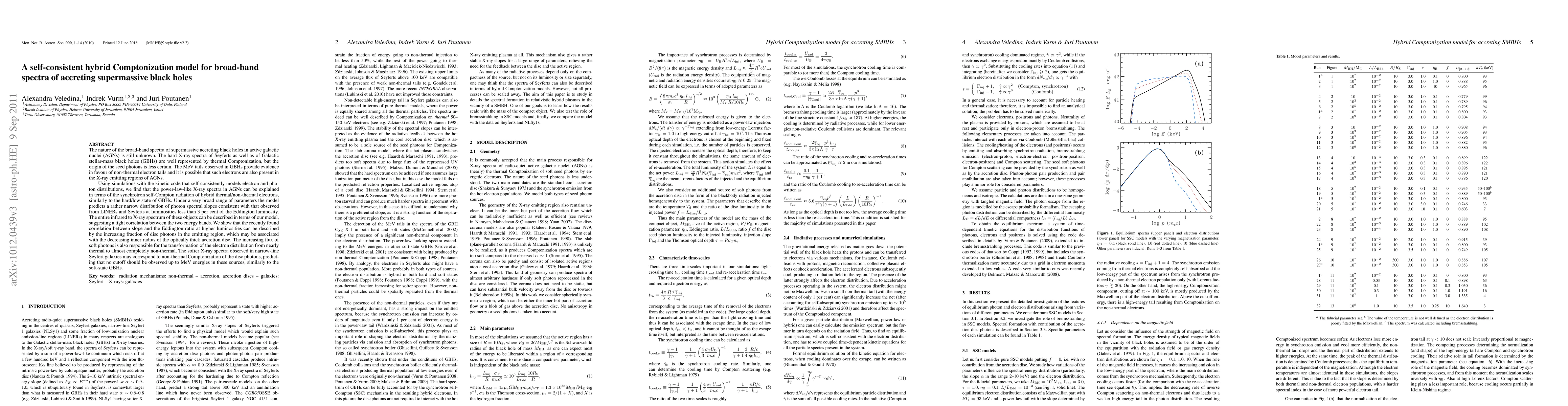The nature of the broad-band spectra of supermassive accreting black holes in active galactic nuclei (AGNs) is still unknown. The hard X-ray spectra of Seyferts as well as of Galactic stellar-mass black holes (GBHs) are well represented by thermal Comptonization, but the origin of the seed photons is less certain. The MeV tails observed in GBHs provide evidence in favour of non-thermal electron tails and it is possible that such electrons are also present in the X-ray emitting regions of AGNs. Using simulations with the kinetic code that self-consistently models electron and photon distributions, we find that the power-law-like X-ray spectra in AGNs can be explained in terms of the synchrotron self-Compton radiation of hybrid thermal/non-thermal electrons, similarly to the hard/low state of GBHs. Under a very broad range of parameters the model predicts a rather narrow distribution of photon spectral slopes consistent with that observed from LINERs and Seyferts at luminosities less than 3 per cent of the Eddington luminosity. The entire infrared to X-ray spectrum of these objects can be described in terms of our model, suggesting a tight correlation between the two energy bands. We show that the recently found correlation between slope and the Eddington ratio at higher luminosities can be described by the increasing fraction of disc photons in the emitting region, which may be associated with the decreasing inner radius of the optically thick accretion disc. The increasing flux of soft photons is also responsible for the transformation of the electron distribution from nearly thermal to almost completely non-thermal. The softer X-ray spectra observed in narrow-line Seyfert galaxies may correspond to non-thermal Comptonization of the disc photons, predicting that no cutoff should be observed up to MeV energies in these sources, similarly to the soft-state GBHs.