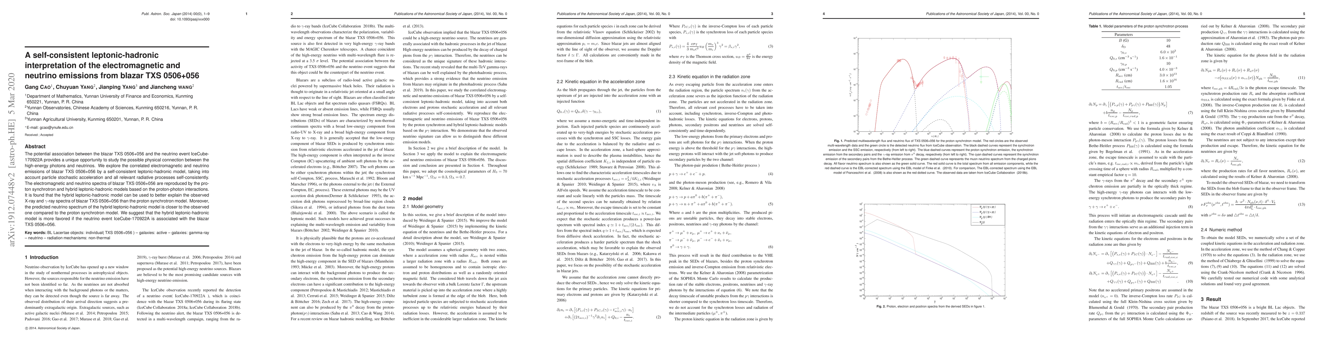 This paper explores the electromagnetic and neutrino emissions from blazar TXS 0506+056 using a self-consistent leptonic-hadronic model. The hybrid model, incorporating proton-photon interactions, better explains the observed X-ray and gamma-ray spectra and the neutrino spectrum compared to the proton synchrotron model, suggesting it is more favored if the neutrino event IceCube-170922A is linked to TXS 0506+056.