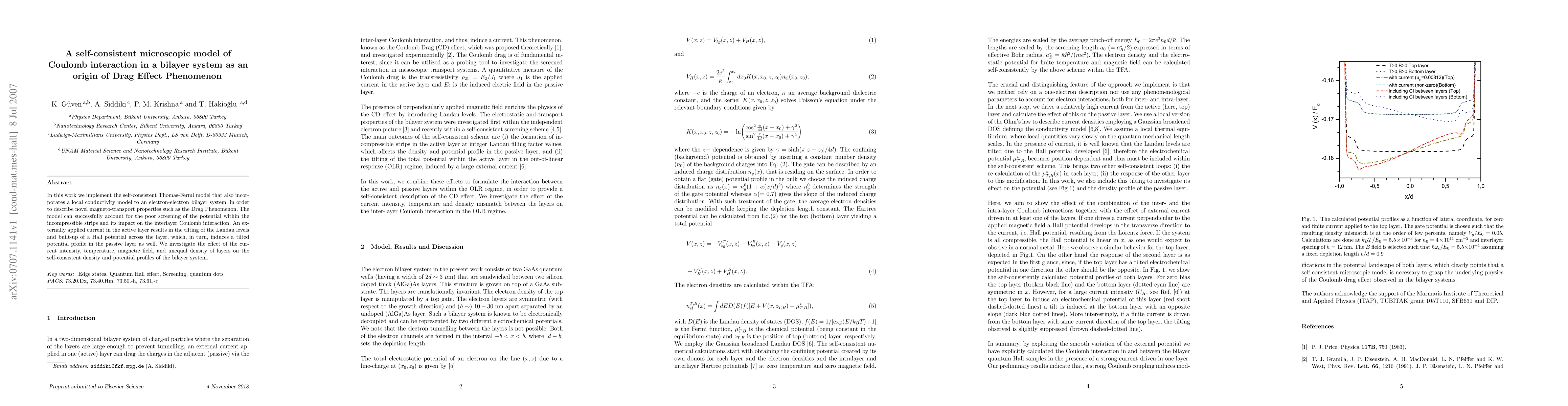 In this work we implement the self-consistent Thomas-Fermi model that also incorporates a local conductivity model to an electron-electron bilayer system, in order to describe novel magneto-transport properties such as the Drag Phenomenon. The model can successfully account for the poor screening of the potential within the incompressible strips and its impact on the interlayer Coulomb interaction. An externally applied current in the active layer results in the tilting of the Landau levels and built-up of a Hall potential across the layer, which, in turn, induces a tilted potential profile in the passive layer as well. We investigate the effect of the current intensity, temperature, magnetic field, and unequal density of layers on the self-consistent density and potential profiles of the bilayer system.