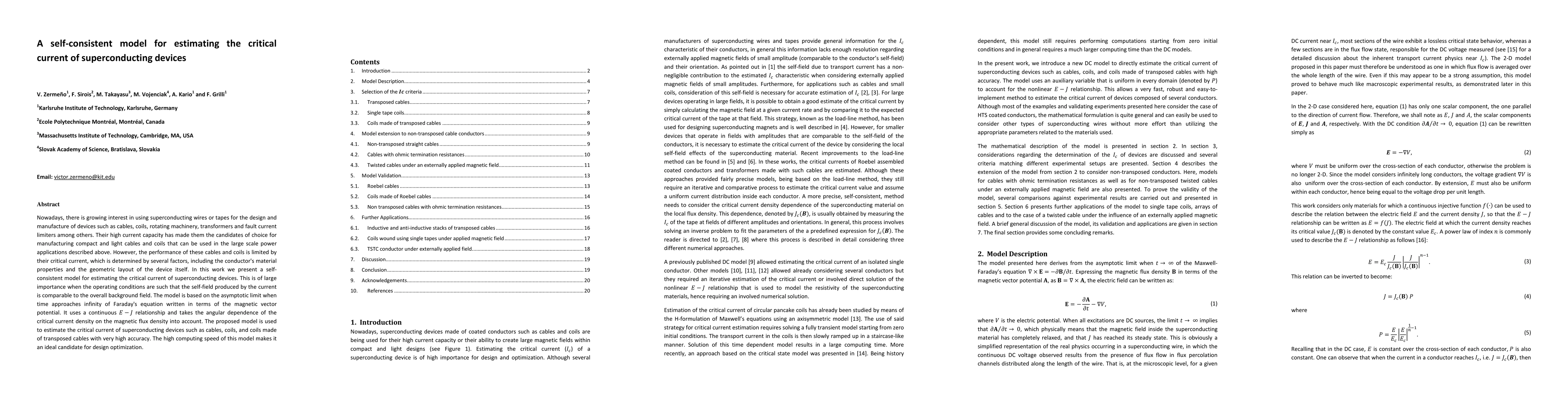 This paper presents a self-consistent model for estimating the critical current of superconducting devices, crucial for optimizing their performance under conditions where self-field effects are significant. The model employs a continuous E-J relationship and considers the angular dependence of the critical current density, providing high accuracy and fast computation for applications like cables, coils, and transformers.