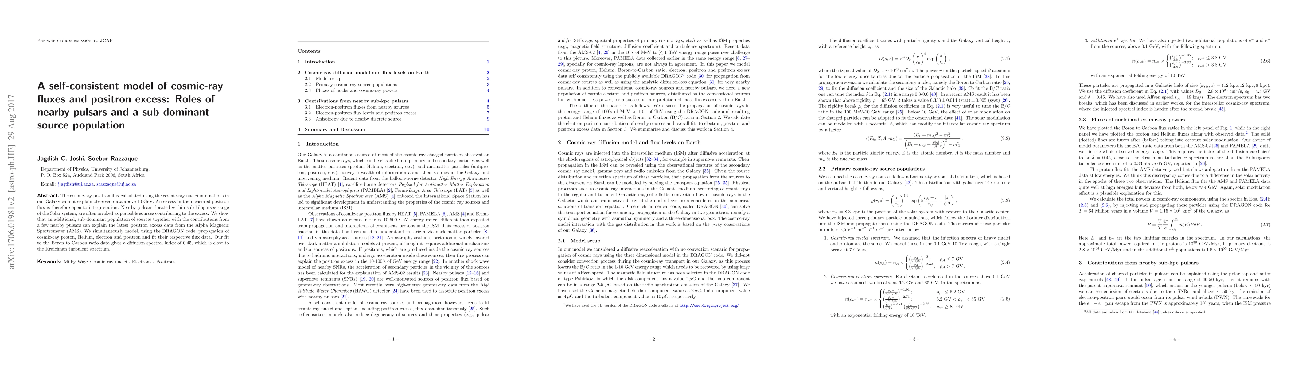 This paper proposes a self-consistent model explaining the observed positron excess in cosmic rays above 10 GeV, attributing it to contributions from nearby pulsars and an additional sub-dominant source population. The DRAGON code is used to model cosmic-ray propagation, achieving a fit with a diffusion spectral index of 0.45.