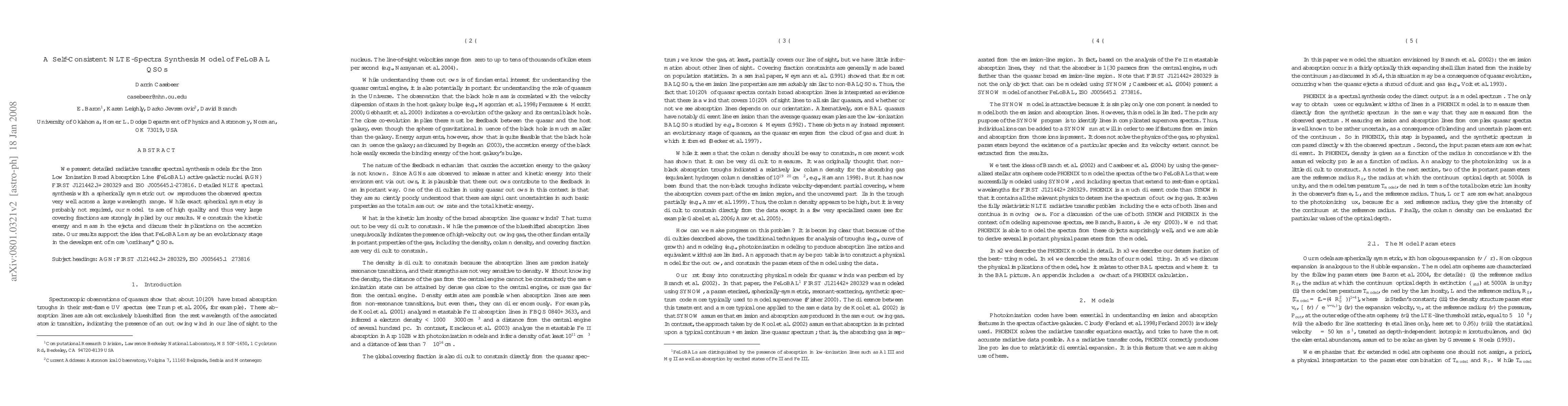 We present detailed radiative transfer spectral synthesis models for the Iron Low Ionization Broad Absorption Line (FeLoBAL) active galactic nuclei (AGN) FIRST J121442.3+280329 and ISO J005645.1-273816. Detailed NLTE spectral synthesis with a spherically symmetric outflow reproduces the observed spectra very well across a large wavelength range. While exact spherical symmetry is probably not required, our model fits are of high quality and thus very large covering fractions are strongly implied by our results. We constrain the kinetic energy and mass in the ejecta and discuss their implications on the accretion rate. Our results support the idea that FeLoBALs may be an evolutionary stage in the development of more ``ordinary'' QSOs.