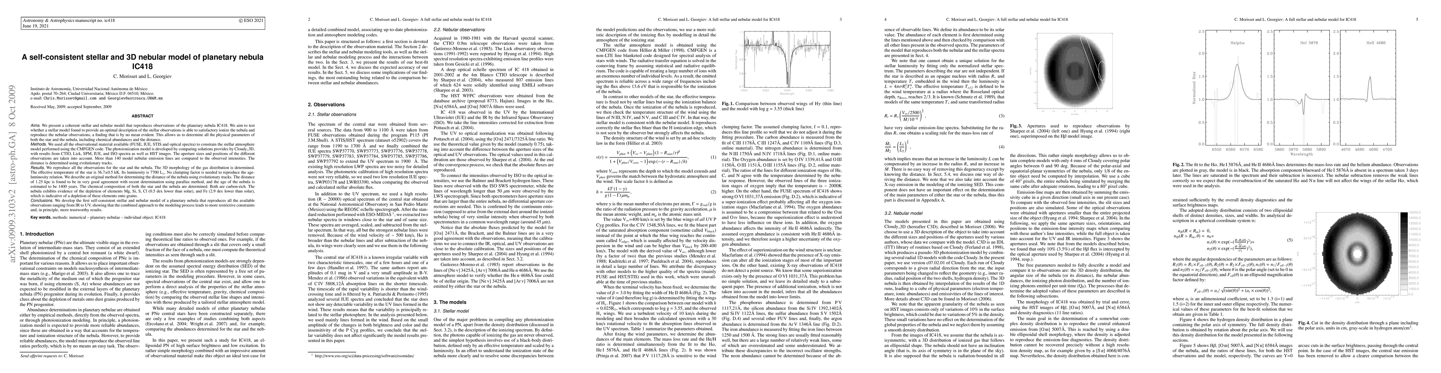 We present a coherent stellar and nebular model reproducing the observations of the Planetary Nebula IC418. We want to test whether a stellar model obtained by fitting the stellar observations is able to satisfactory ionize the nebula and reproduce the nebular observations, which is by no mean evident. This allows us to determine all the physical parameters of both the star and the nebula, including the abundances and the distance. We used all the observational material available (FUSE, IUE, STIS and optical spectra) to constrain the stellar atmosphere model performed using the CMFGEN code. The photoionization model is done with Cloudy_3D, and is based on CTIO, Lick, SPM, IUE and ISO spectra as well as HST images. More than 140 nebular emission lines are compared to the observed intensities. We reproduce all the observations for the star and the nebula. The 3D morphology of the gas distribution is determined. The effective temperature of the star is 36.7kK. Its luminosity is 7700 solar luminosity. We describe an original method to determine the distance of the nebula using evolutionary tracks. No clumping factor is need to reproduce the age-luminosity relation. The distance of 1.25 kpc is found in very good agreement with recent determination using parallax method. The chemical composition of both the star and the nebula are determined. Both are Carbon-rich. The nebula presents evidence of depletion of elements Mg, Si, S, Cl (0.5 dex lower than solar) and Fe (2.9 dex lower than solar). This is the first self-consistent stellar and nebular model for a Planetary Nebula that reproduces all the available observations ranging from IR to UV, showing that the combined approach for the modeling process leads to more restrictive constraints and, in principle, more trustworthy results.